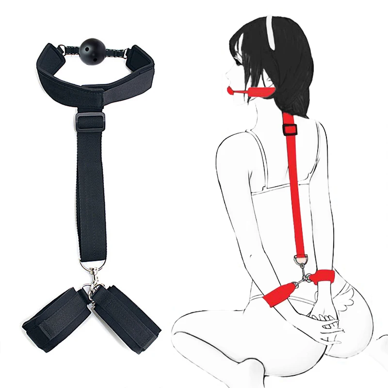 Эротические наручники на спину с шеей, кляп для рта, шар для женско...