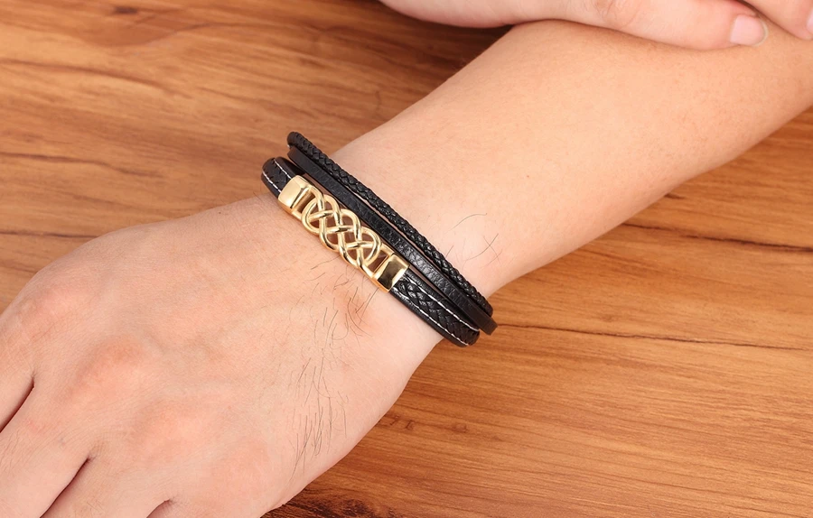 Классический многослойный мужской кожаный браслет из нержавеющей ст...
