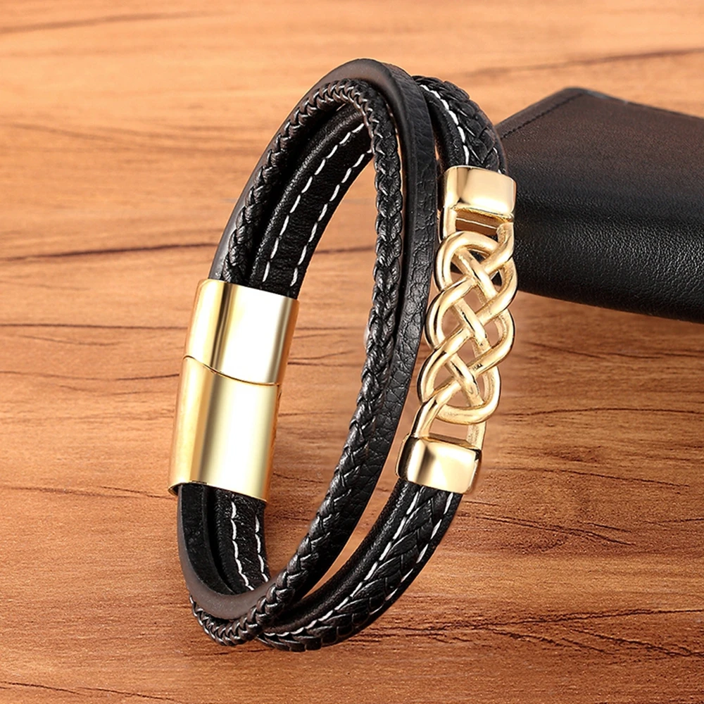 Мужской браслет из нержавеющей стали, многослойный кожаный браслет,...