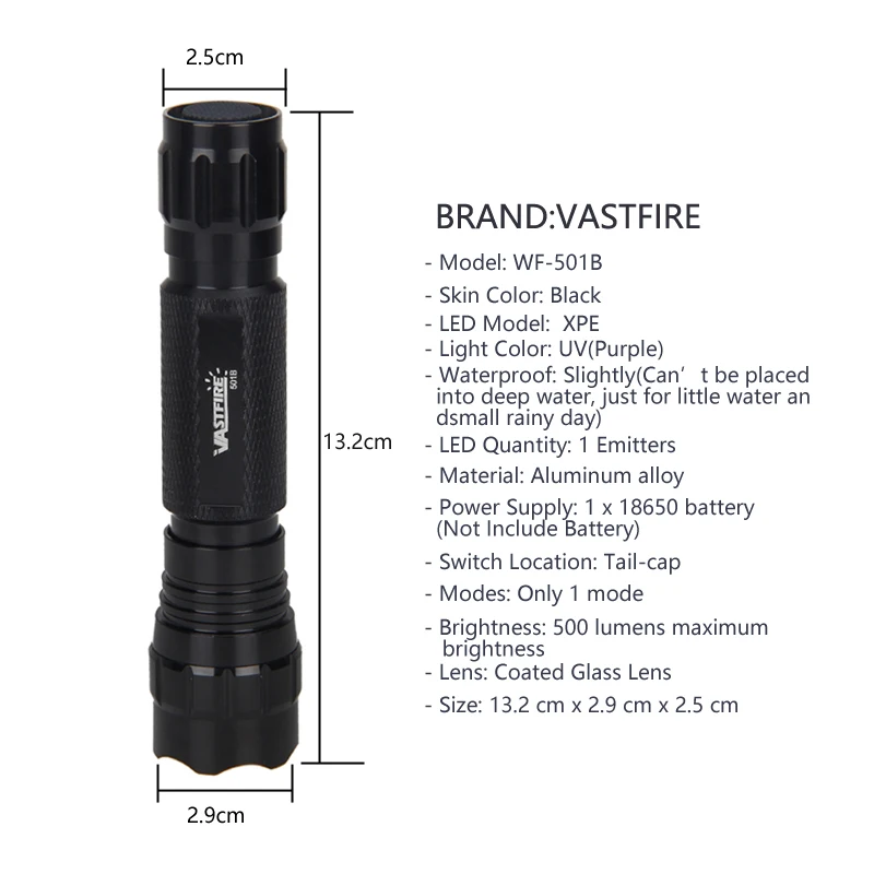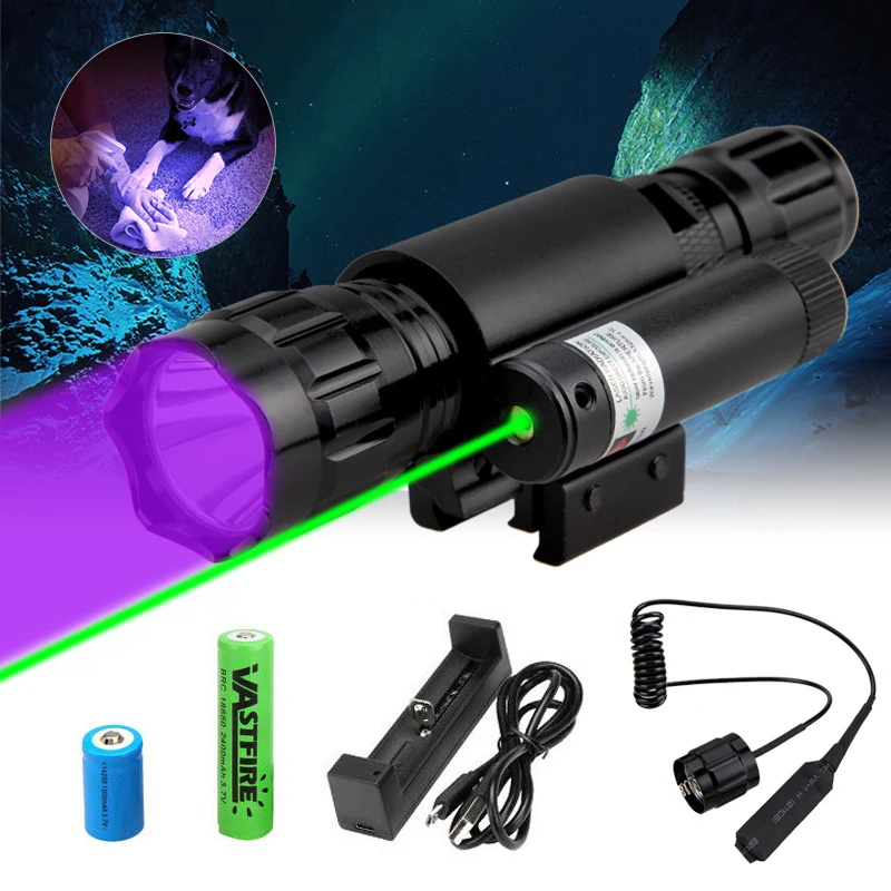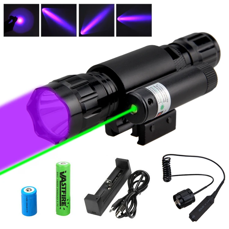 Фонарик:Материал фонарика: 6061T алюминийПрочный ударопрочный ободок для усиленной самозащитыЛампа: Q5 фиолетовыйЛюмены: 5000 люменов на выходе (макс.)Работают Напряжение: 3,7 VБатареи: аккумулятор 18650-1 шт.Переключатель 1: задняя крышка ВКЛ./ВЫКЛ.Ежедневный Водонепроницаемый, используйте его в дождливый день, никаких проблемФонарик Диаметр: 13,2x2,9x2,9 смЗеленая лазерная точка:Подходит для большинства пистолетов с передней планкой weaver/pica tinny rail со слотом для перекладины, крепление 20 ммПереключатель ВКЛ/ВЫКЛ расположен в задней части зеленого лазерного прицелаПодходит для 20 мм лазерного прицела или крепления трубки фонарикаWindage & Elevation регулируемый с поставляемым шестигранным ключом20 мм рельсовое креплениеТип: зеленый лазерЦвет: черныйМощность лазера: 5 мВтДлина волны лазера: 532-650nmВыход: 100 люменовСветильник: 5 часовРаботают Напряжение: 3,7 VДлина: 86 ммТип батареи: аккумулятор 1*14250Размер: 86 мм x 53 мм x 48 мм, мини-стиль Посылка типа 1 включает в себя1 * фиолетовый охотничий фонарик Посылка типа 2 включает в себя1 * фиолетовый охотничий фонарик1 * USB зарядка1 * аккумулятор 18650Посылка типа 3 включает в себя1 * Зеленая лазерная точка1 * CR2 батареяПосылка типа 4 включает в себя1 * фиолетовый охотничий фонарик1 * дистанционный переключатель давления1 * USB зарядка1 * аккумулятор 186501 * CR2 батарея1 * Зеленая лазерная точка