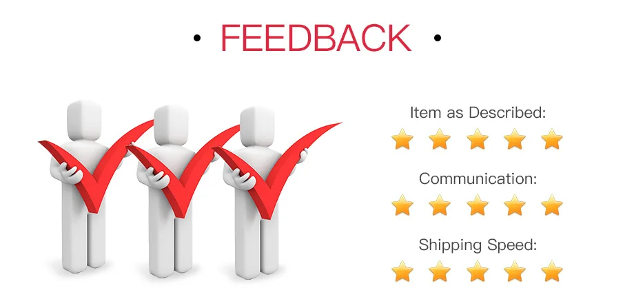 Удовлетворение ваших запросов и положительная обратная связь очень важны для нас. Пожалуйста, оставьте положительные отзывы и 5 звезд, если вы удовлетворены нашими товарами и услугами. Если вы остались недовольны качеством товара и обслуживания, не торопитесь подтверждать получение товара и писать негативный отзыв. Сначала свяжитесь с нами. Мы сделаем все возможное, чтобы решить любую проблему и предоставить Вам лучшее обслуживание клиентов. Если у вас есть какие-либо вопросы, пожалуйста, свяжитесь с нами. Хорошего дня