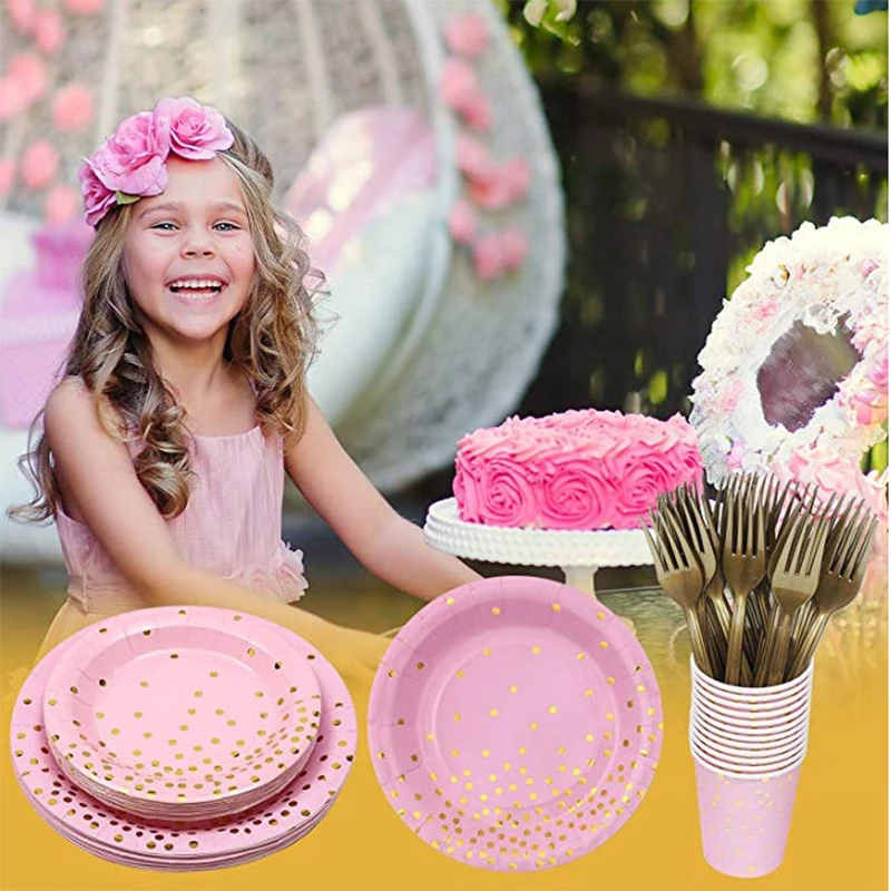 Одноразовая посуда в розовый Золотой горошек для свадьбы, бумажный ...