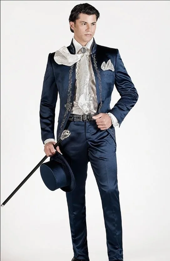 Костюм облегающего покроя для жениха, смокинг с вышивкой для жениха, темно-синие атласные мужские костюмы, Свадебный Мужской лучший костюм, 2 шт. (пиджак + брюки + галстук)