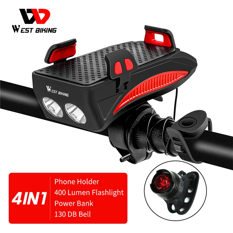 Светильник WEST BIKING 4 в 1, со вспышкой, звуковой сигнал, держатель для телефона, внешний аккумулятор, велосипедные аксессуары, Передний фонарь