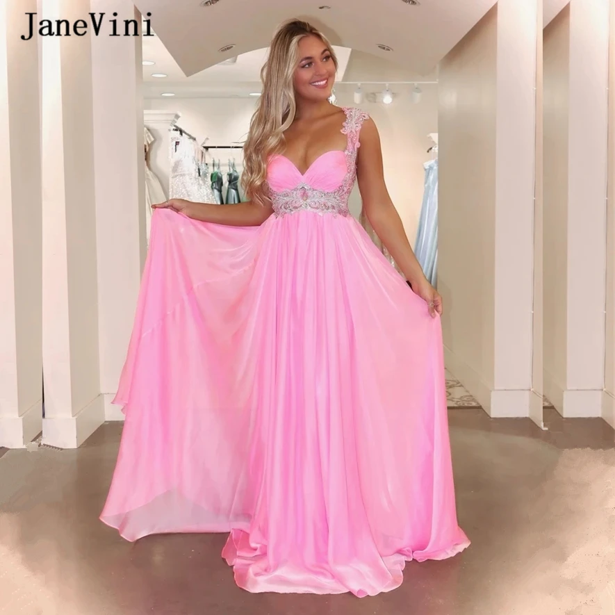 JaneVini очаровательные розовые шифоновые длинные платья для выпускного вечера 2020 Милая аппликация бисером с открытой спиной трапециевидная длина до пола Формальные платья для выпускного вечера