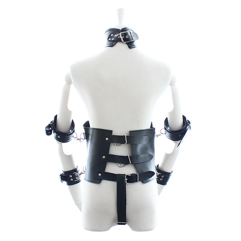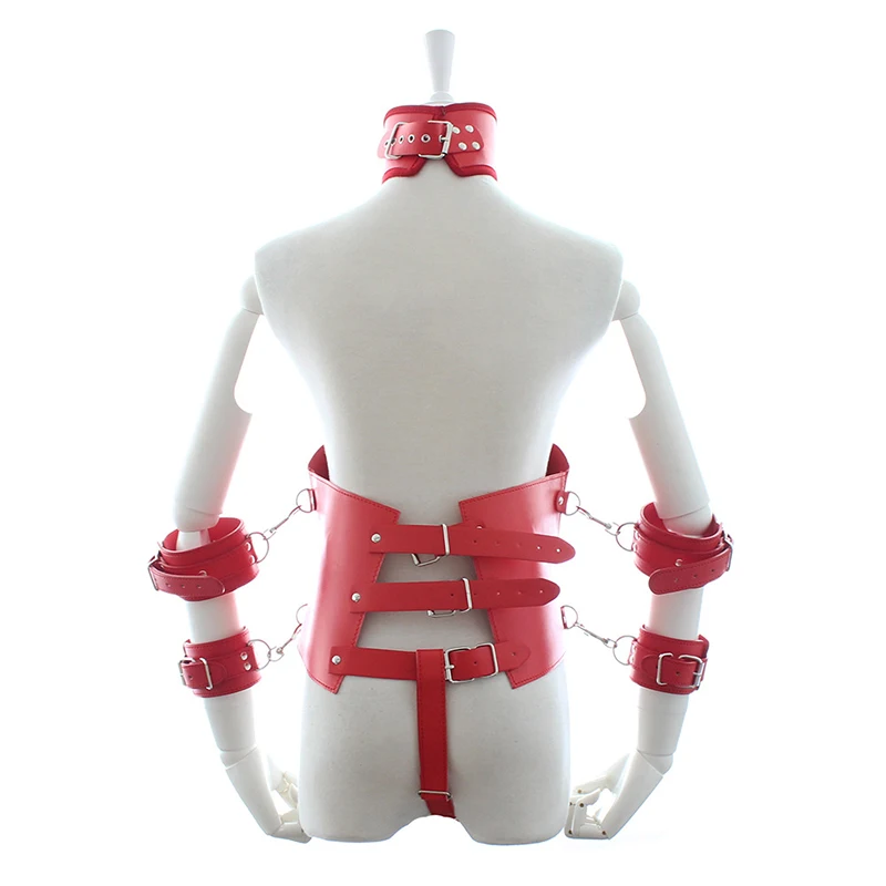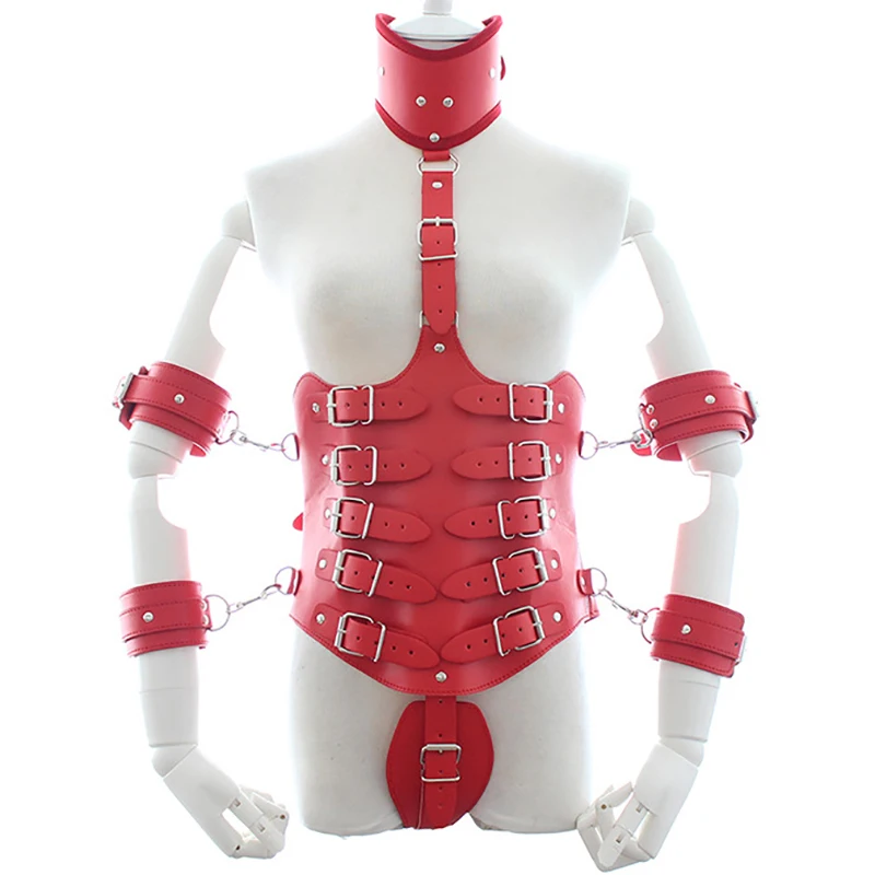 БДСМ игрушки для связывания кожаный корсет, бондаж для тела смирительная рубашка с манжетами на руку наручники Шея воротник, портупея секс-товары