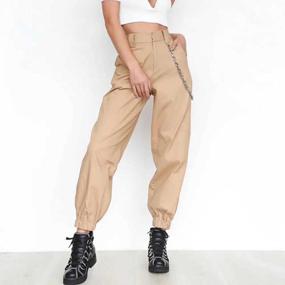 Женские брюки-карго с высокой талией Safari, однотонные свободные длинные спортивные штаны в стиле панк с цепочкой, Стильные повседневные штаны в стиле хип-хоп
