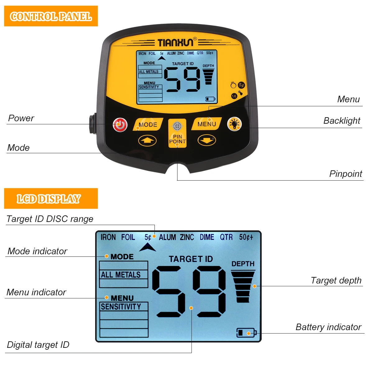 Регулируемая чувствительность-Настройка 12 видов различных настроек чувствительности для различных целей или условий окружающей среды.Супер большая поисковая катушка DD-15,0 "x 11,4" супер большая Водонепроницаемая поисковая катушка с защитной