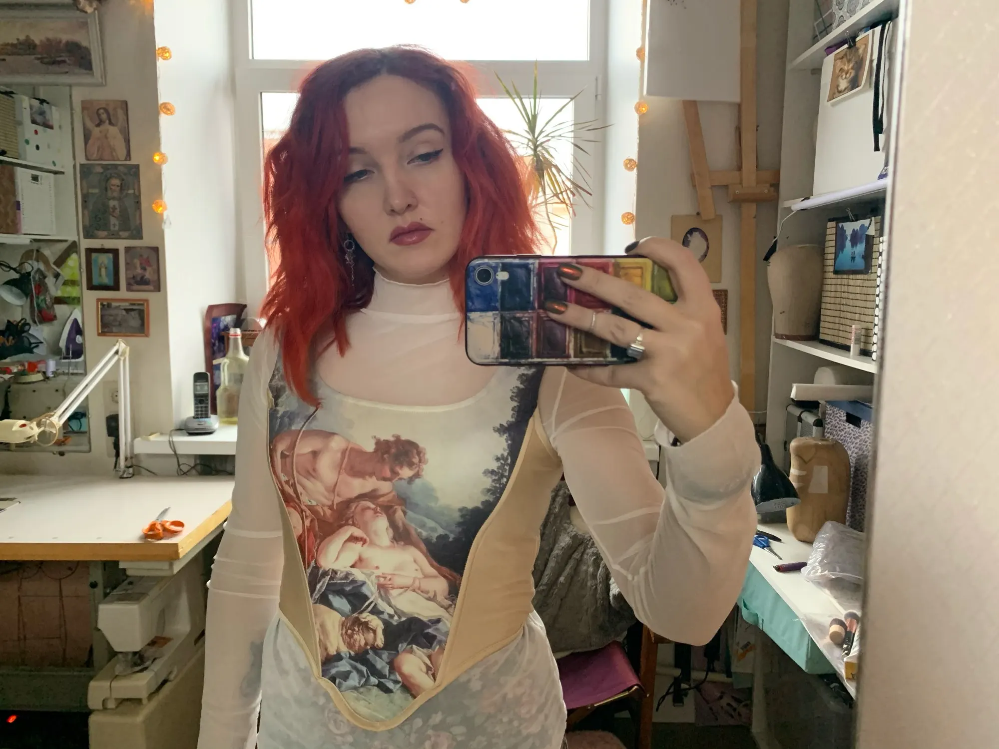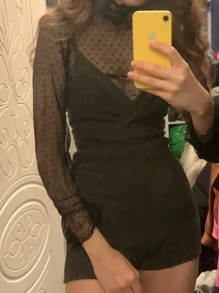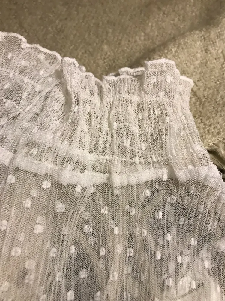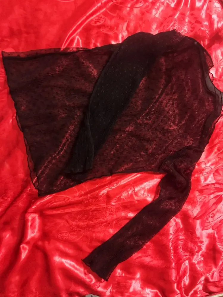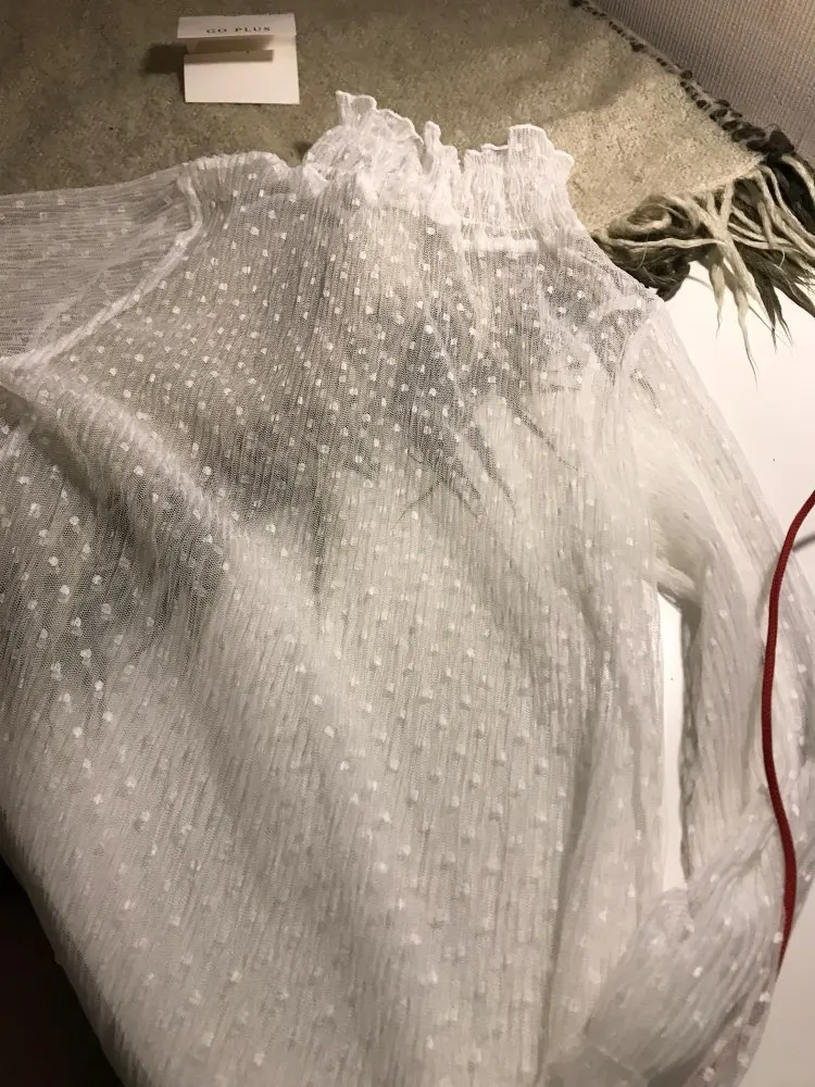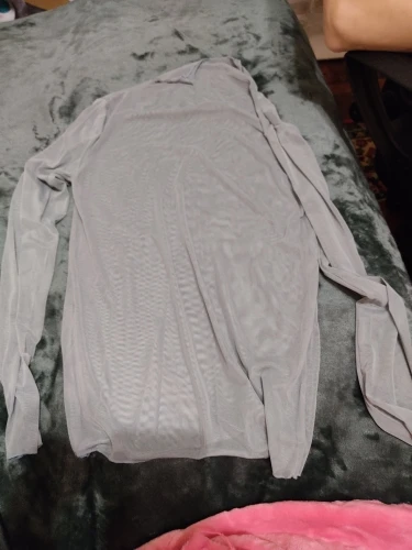 Хорошее качество шитья. Сетка довольно грубая, но эластичная. Плечевые швы опускаются, и я думаю, что они совпадают с моим маленьким размером. Блузка будет хорошо выглядеть на стройной высокой женщины с широкими плечами и длинным вырезом.