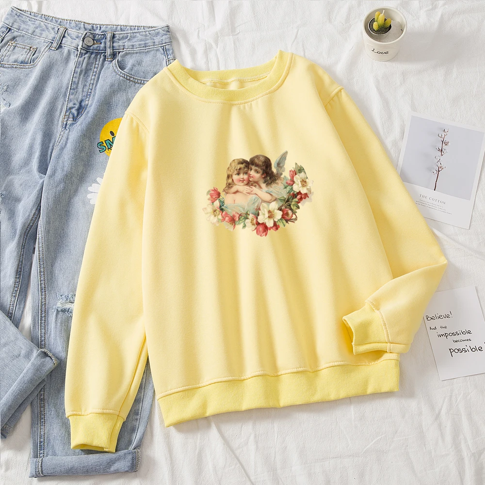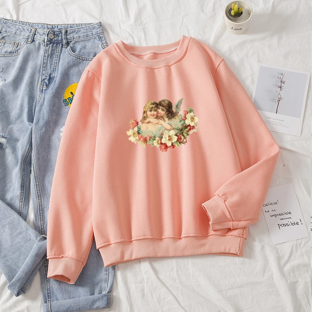 Повседневная Женская Толстовка Harajuku с графическим принтом, толстовка с круглым вырезом, Осенний хлопковый пуловер, Женский пуловер оверсайз с принтом ангела, Женский пуловер с капюшоном