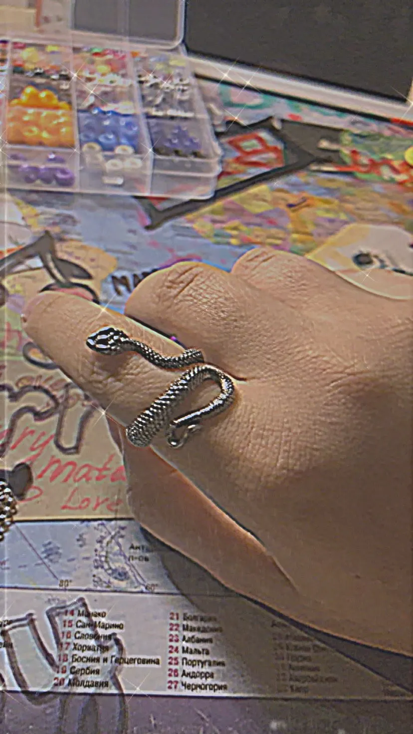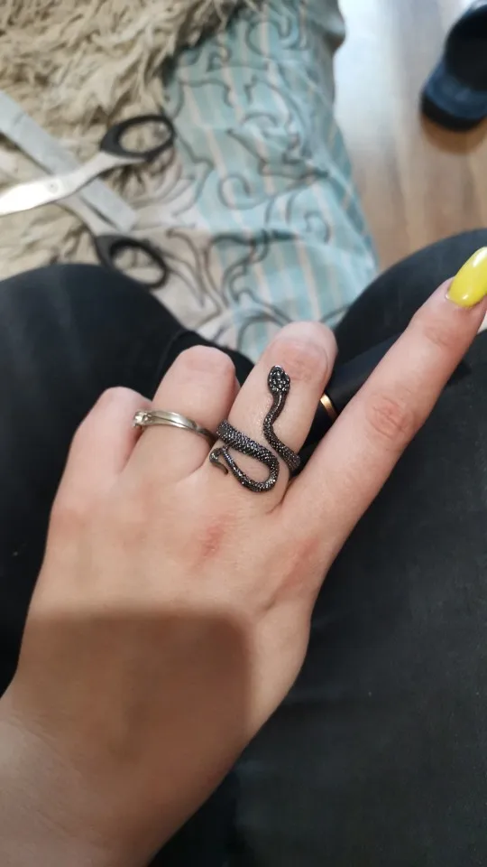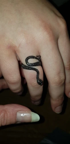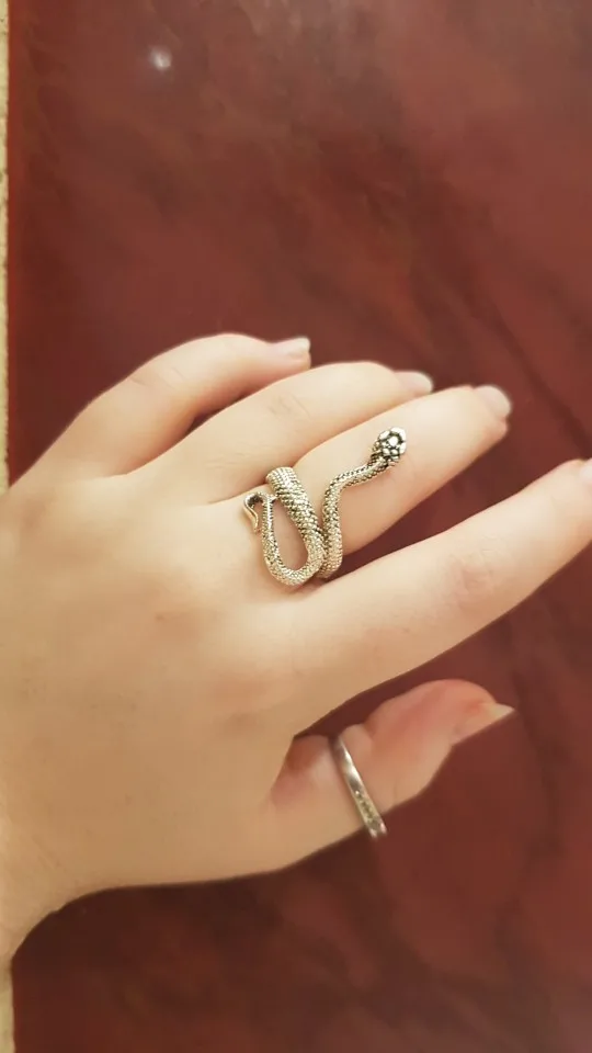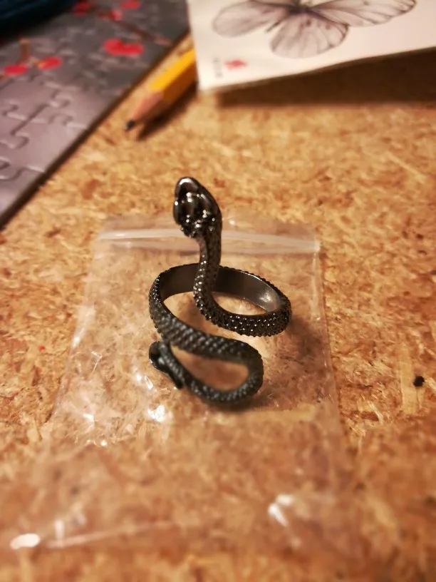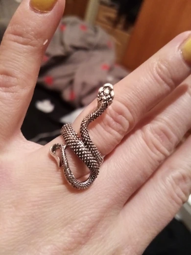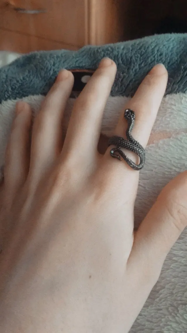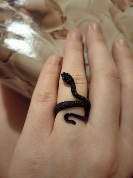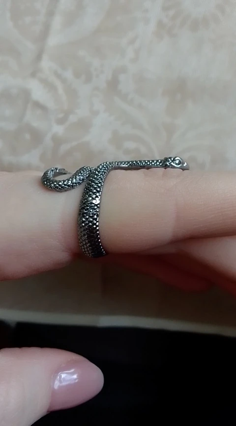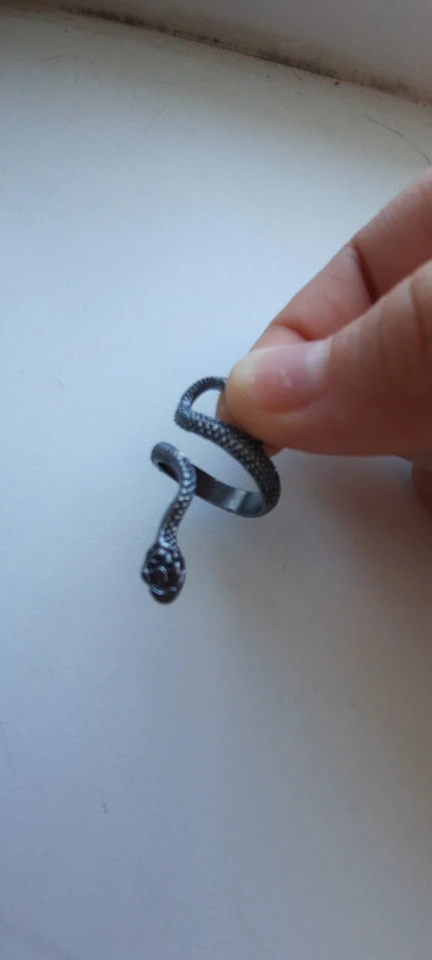 Кольцо красивое и прикольное. Получила чёрное кольцо и спустя пару дней краска облезла на выпуклых частях змеи при носке(можно ногтем легко оттереть), но выглядит так даже неплохо. Но я его решила не носить как кольцо на повседневной основе, тк прочла, что оно сделано из цинкового сплава. В целом оч довольна, за такую-то цену.