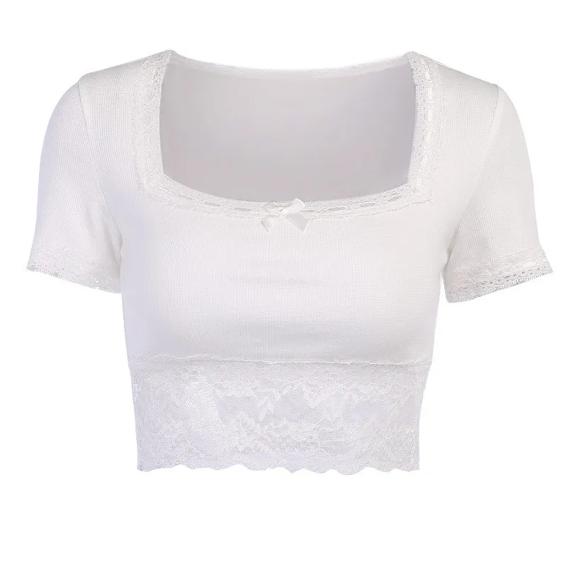 Женская футболка InstaHot, с кружевным боковым квадратным воротнико...