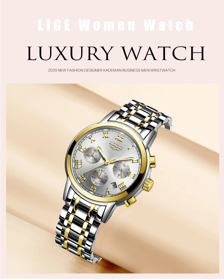 Часы наручные LIGE женские кварцевые, модные деловые брендовые стал...