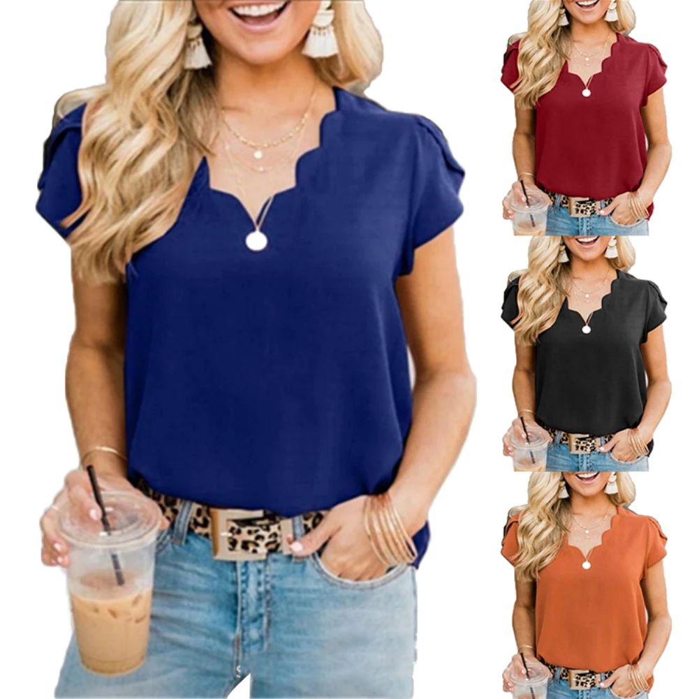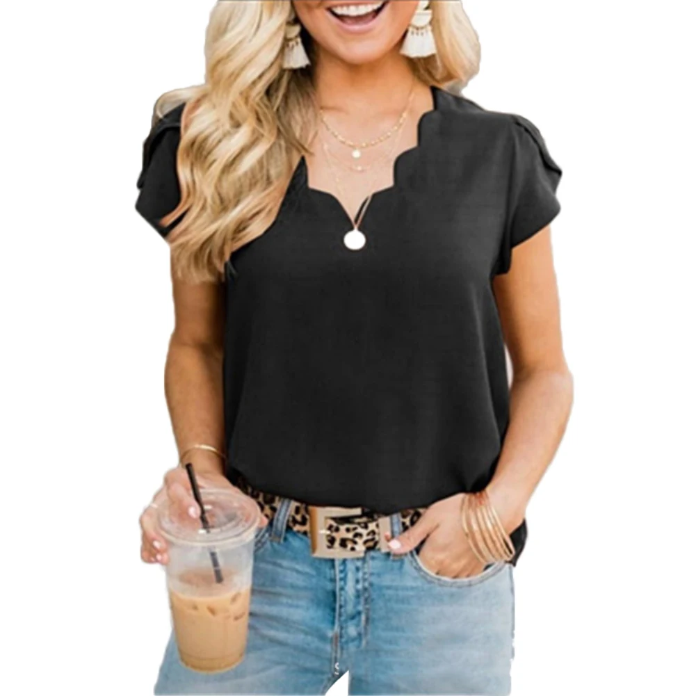 Женский офисный однотонный волнистый вырез, v-образный вырез, короткий рукав, летняя мода, Тонкий Топ, рубашки, черный цвет