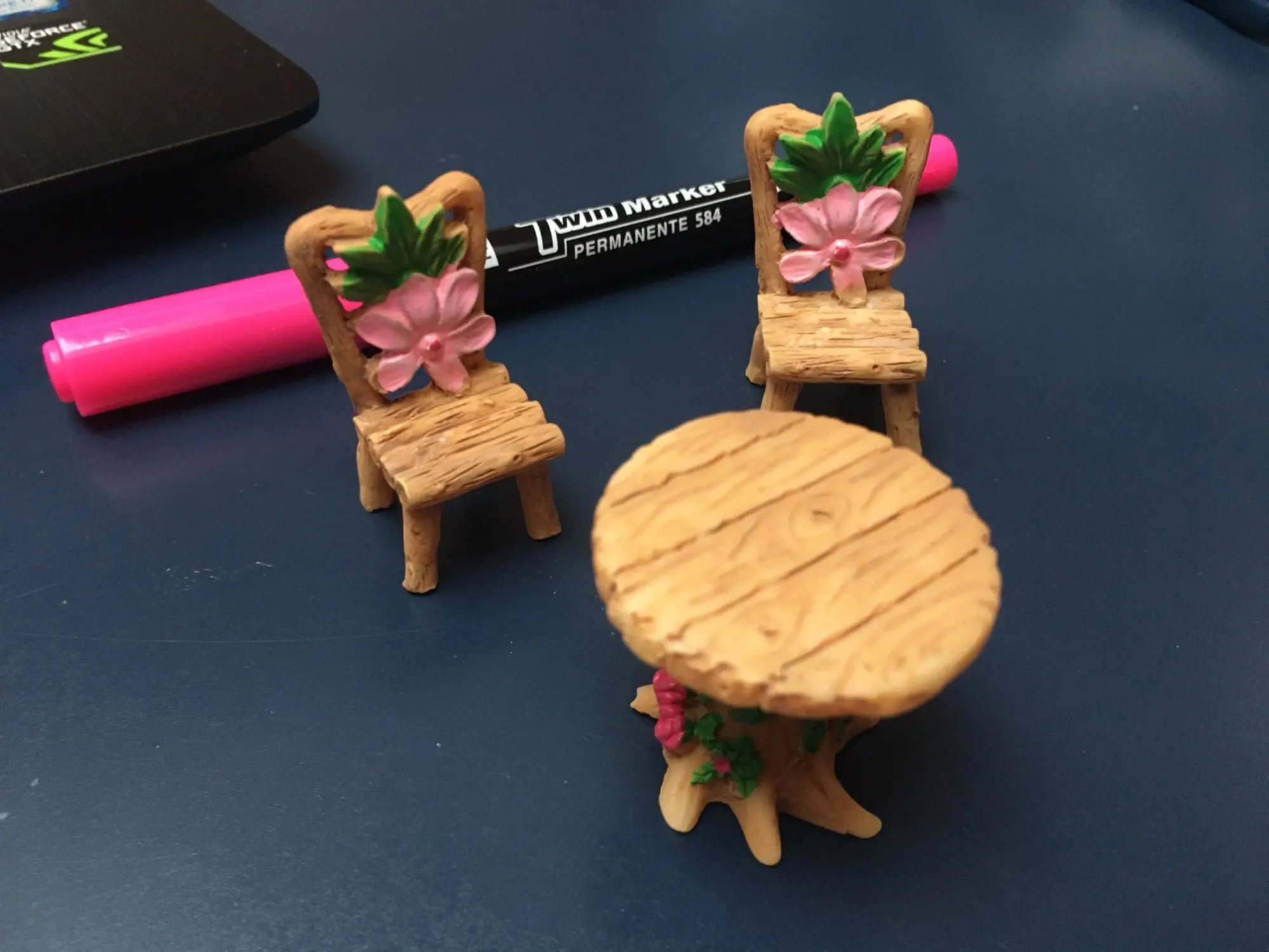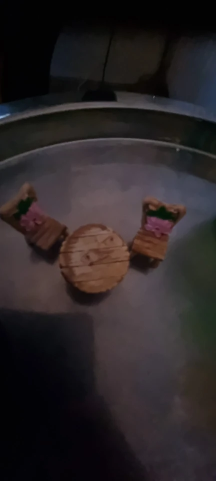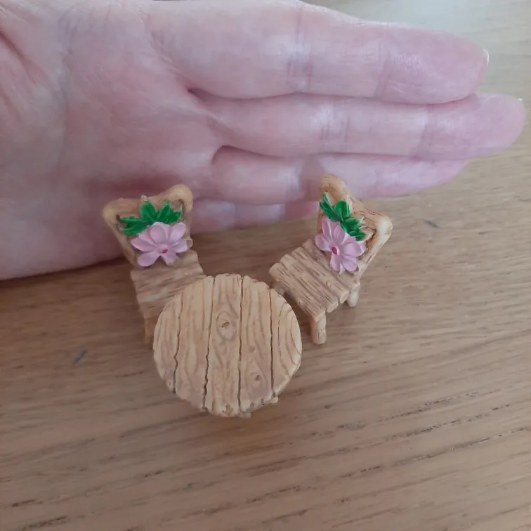 The cutest miniature table and chairs set! Looks very similar to the pic (flowers on chairs are pink not white though). Delivery was just under 3 weeks. Measurements - chairs are just under 4cm tall and table is just under 3cm tall! Love them.