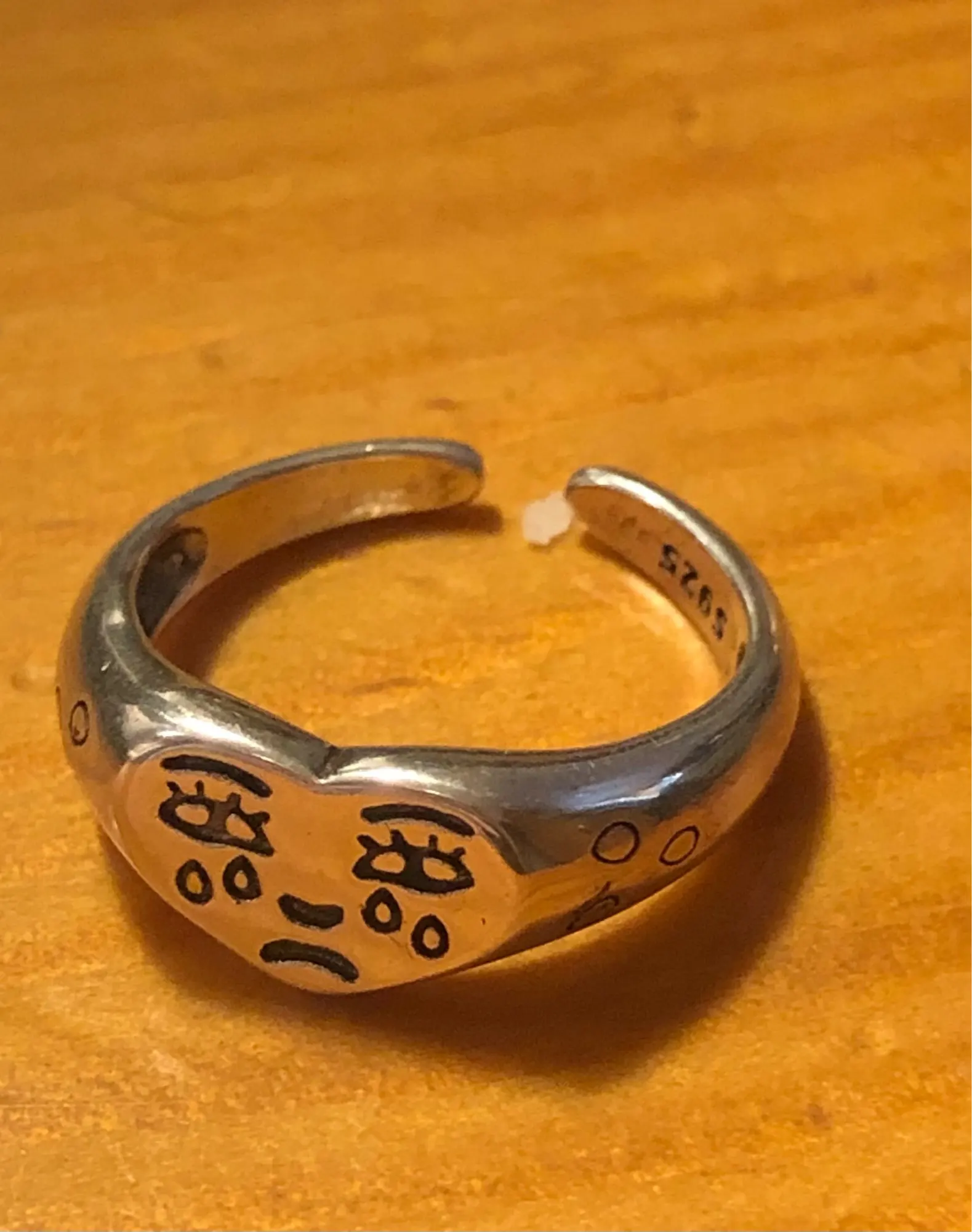 Товар соответствует описанию. Гравировка неплохая, намного лучше, чем она разделена. Сзади он открывается, так что вы можете настроить его на палец, хотя это стоит достаточно, чтобы открыть его, это довольно сложно, но это ценится, так что он не дает со временем