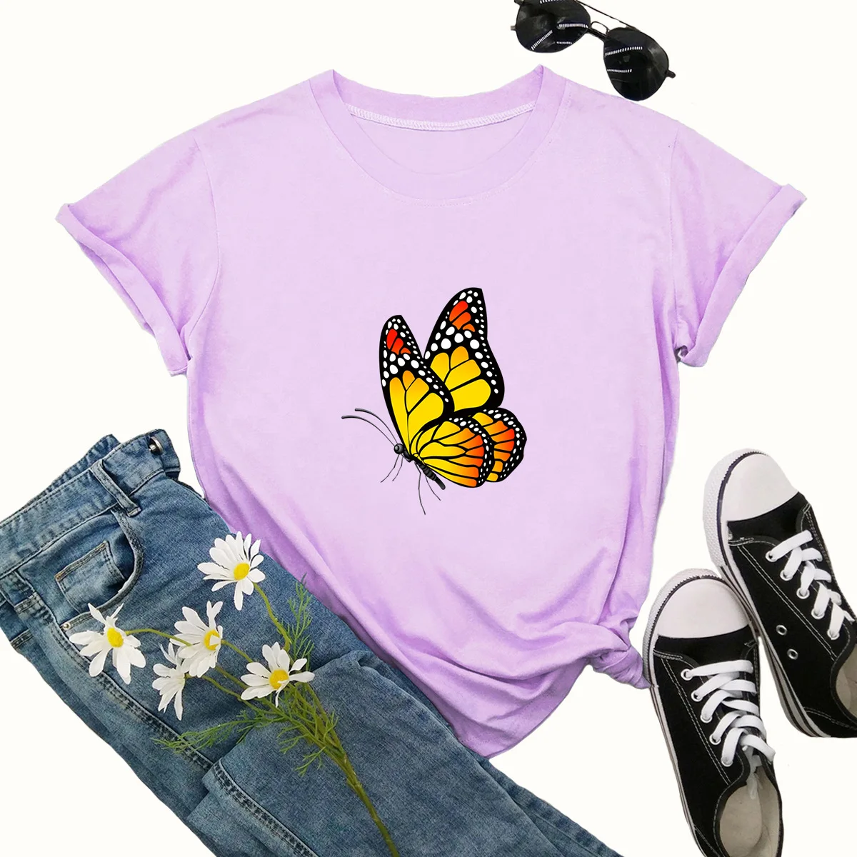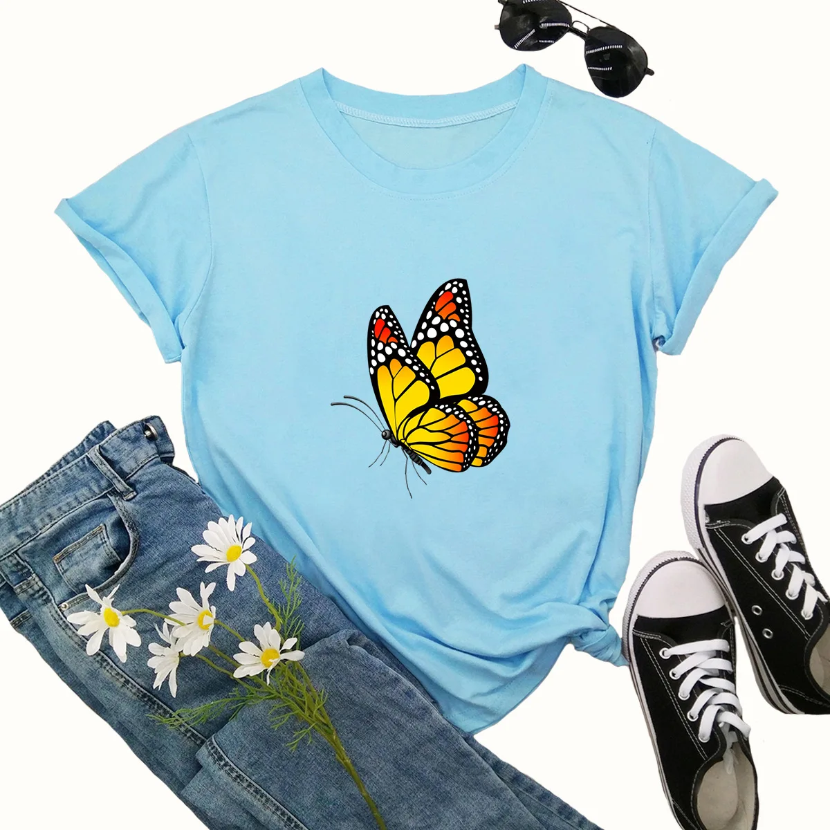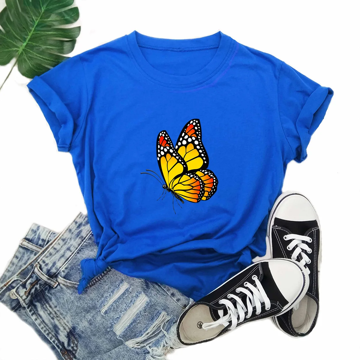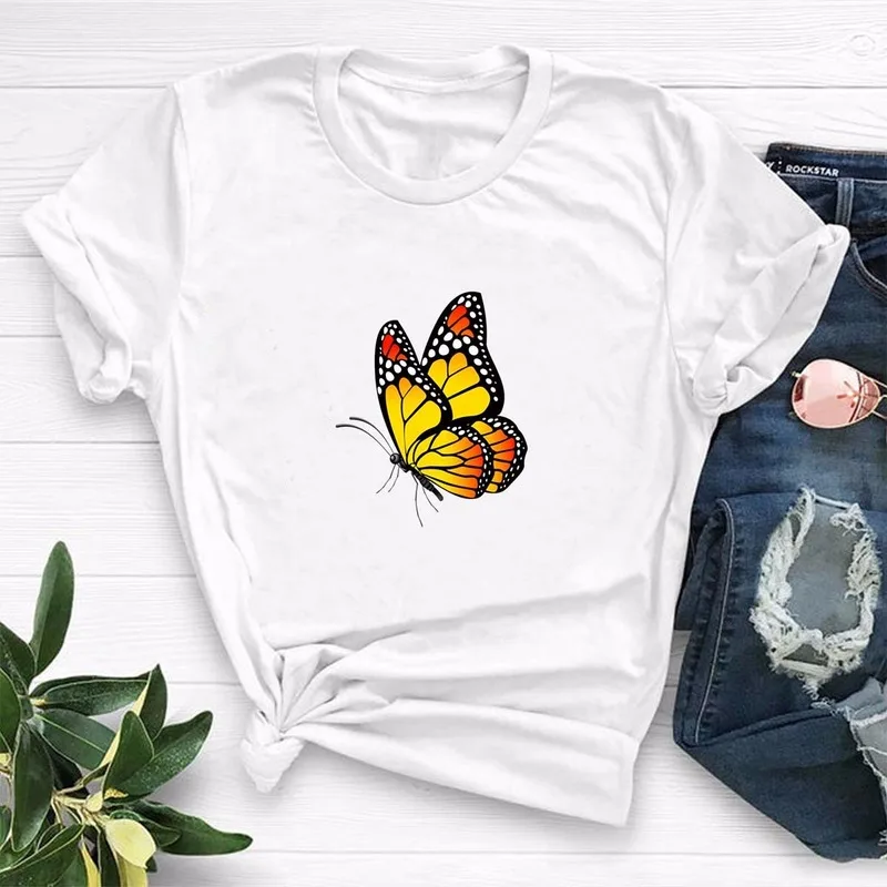 Летняя женская футболка 4XL, 5XL, размера плюс хлопок, с мультяшным принтом бабочек, с коротким рукавом, повседневная женская футболка с круглым вырезом, футболки, Топ