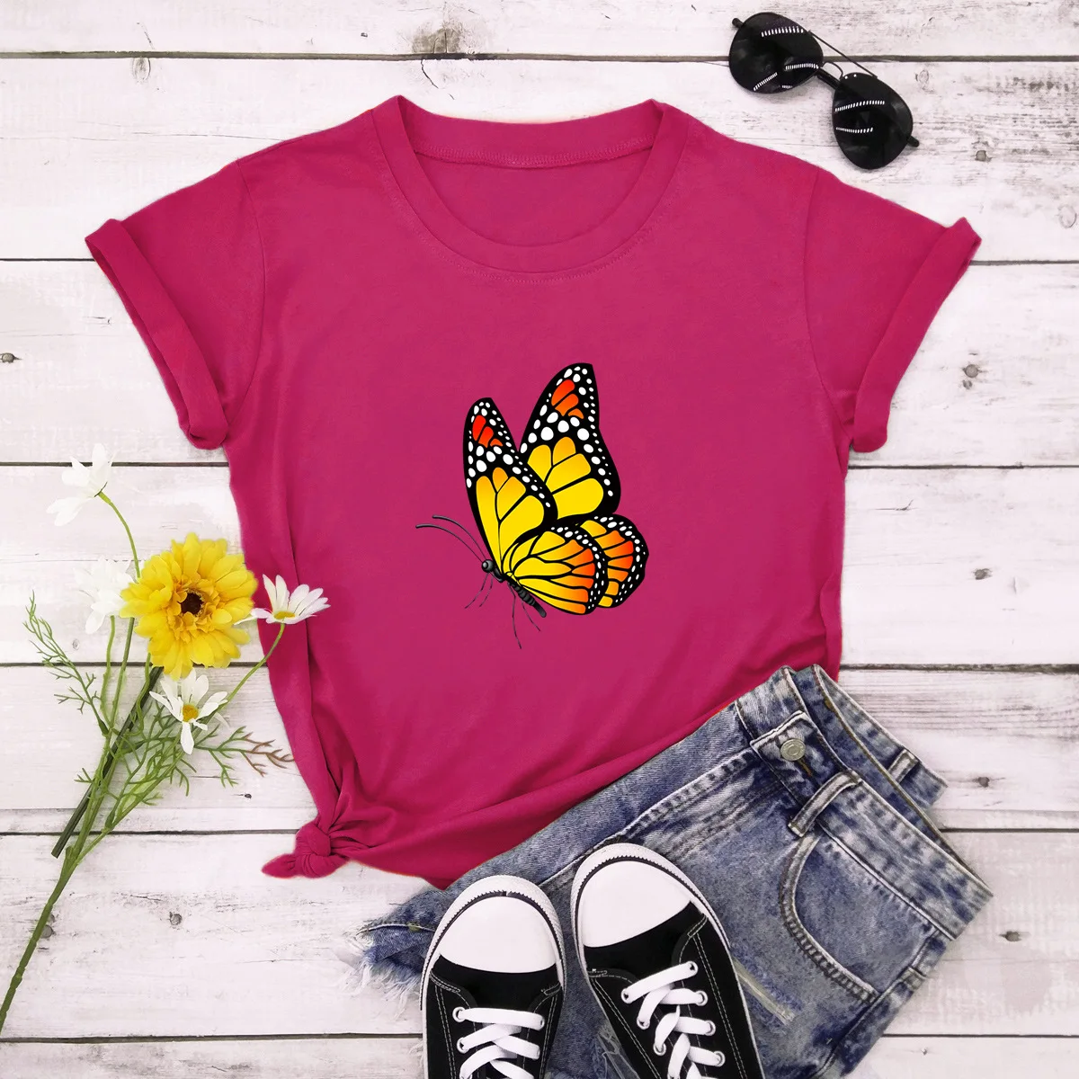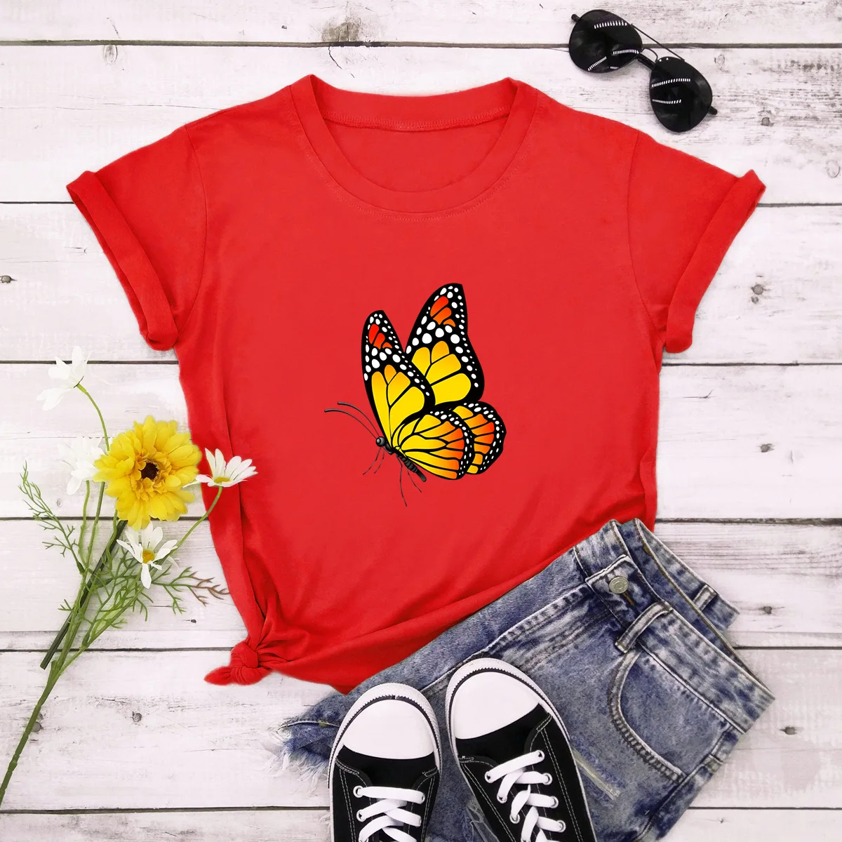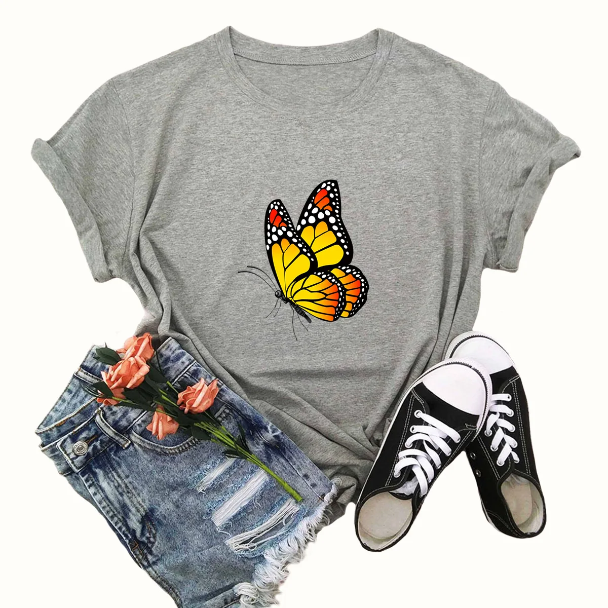 Летняя женская футболка 4XL, 5XL, размера плюс хлопок, с мультяшным принтом бабочек, с коротким рукавом, повседневная женская футболка с круглым вырезом, футболки, Топ