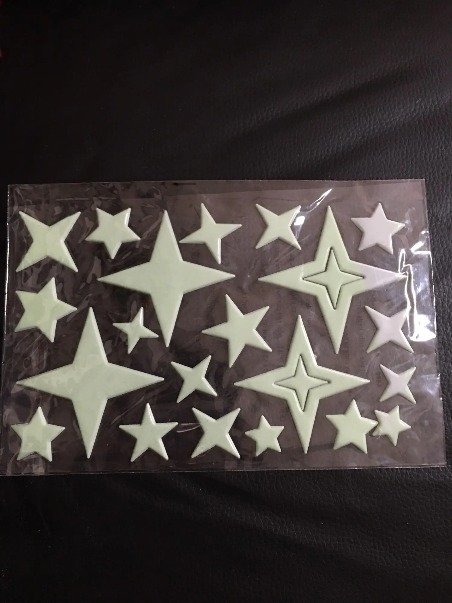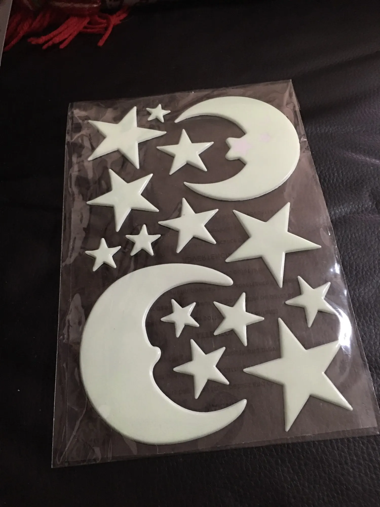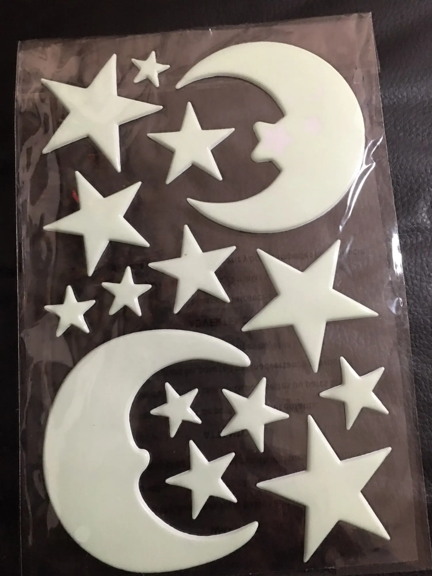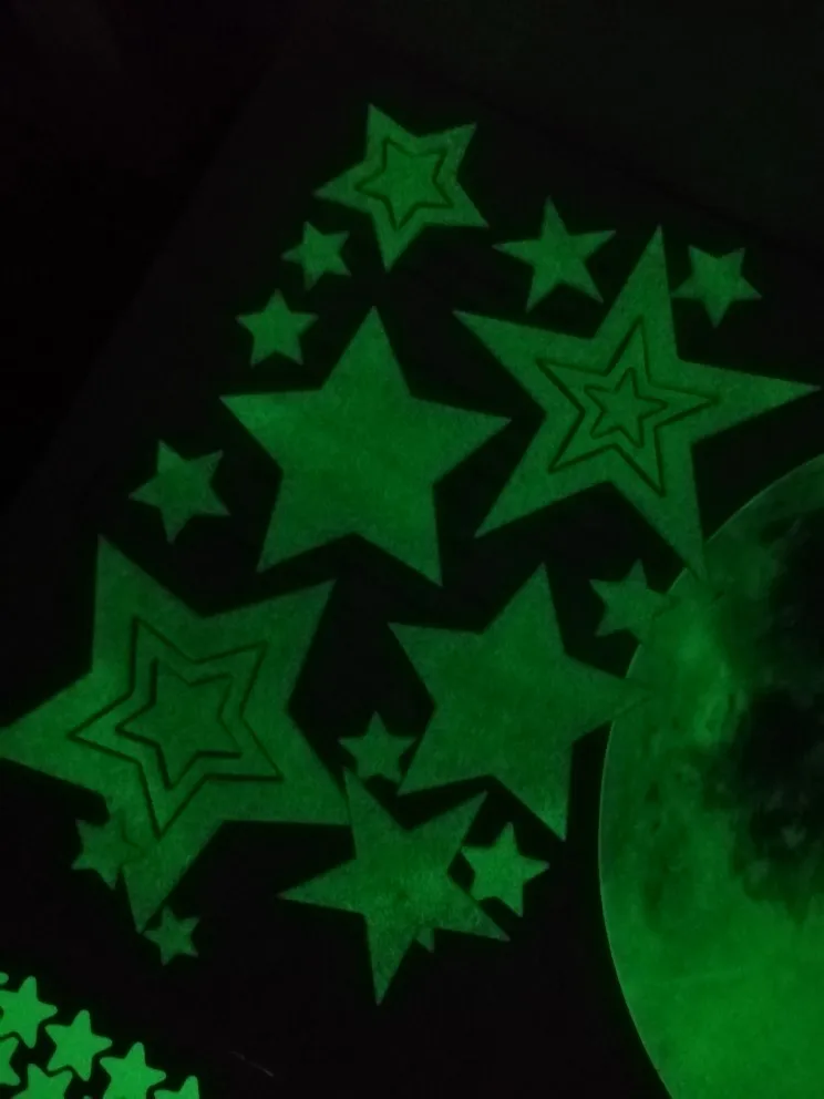 Пришли конечно мятые((( но мы их под пресс на пару дней и они выправились. На обоях держатся слабо, а вот на покрашенной стене водоэмульсионкой - отлично!!! Снимутся только с краской (пробывали)))) светятся долго, до самого утра)) доставка суперрр быстрая 2-3 недели Кубань. Заказали ещё комплект для племянника! Оооочень рекомендую))