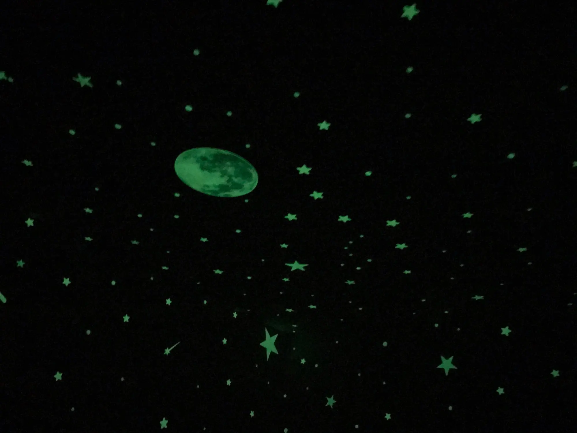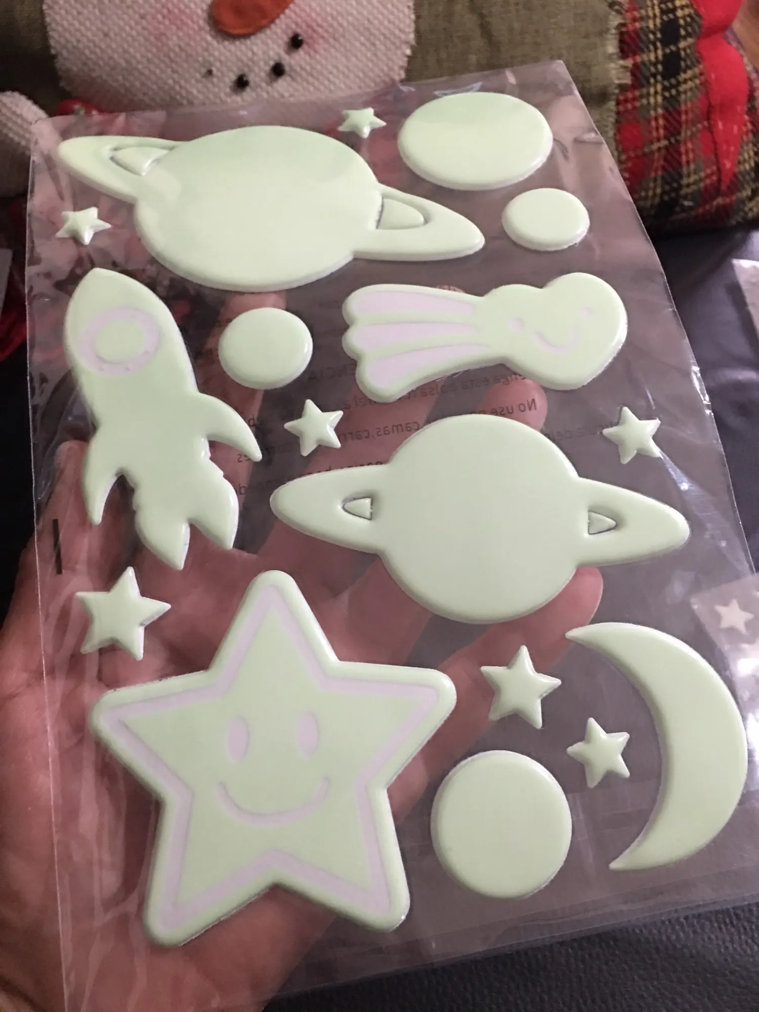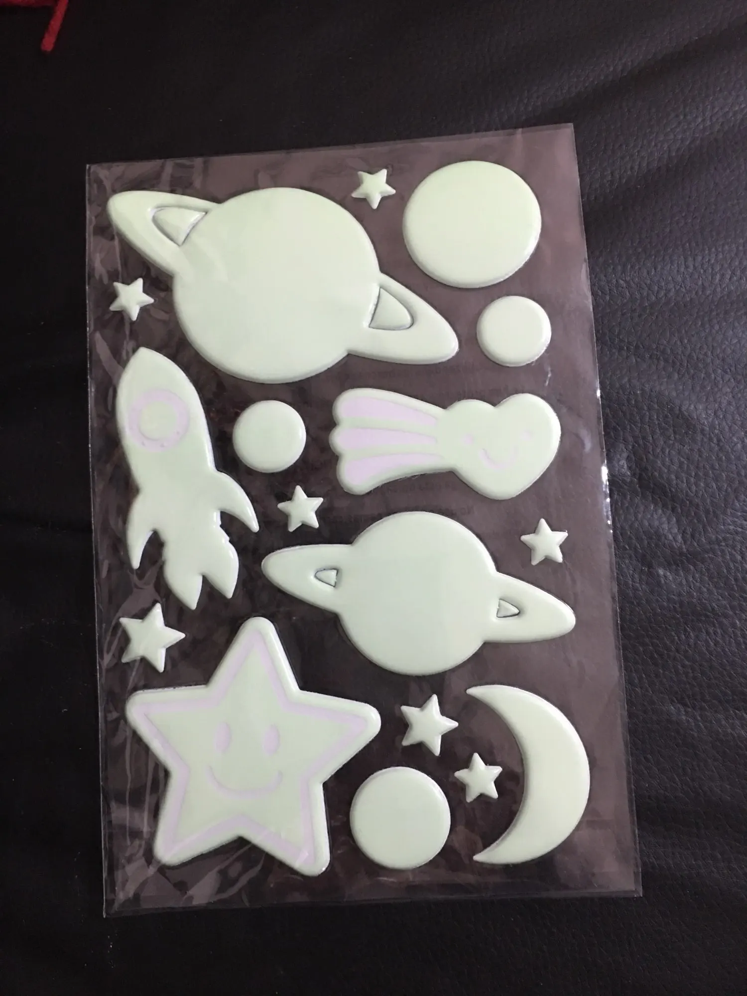 Пришли конечно мятые((( но мы их под пресс на пару дней и они выправились. На обоях держатся слабо, а вот на покрашенной стене водоэмульсионкой - отлично!!! Снимутся только с краской (пробывали)))) светятся долго, до самого утра)) доставка суперрр быстрая 2-3 недели Кубань. Заказали ещё комплект для племянника! Оооочень рекомендую))