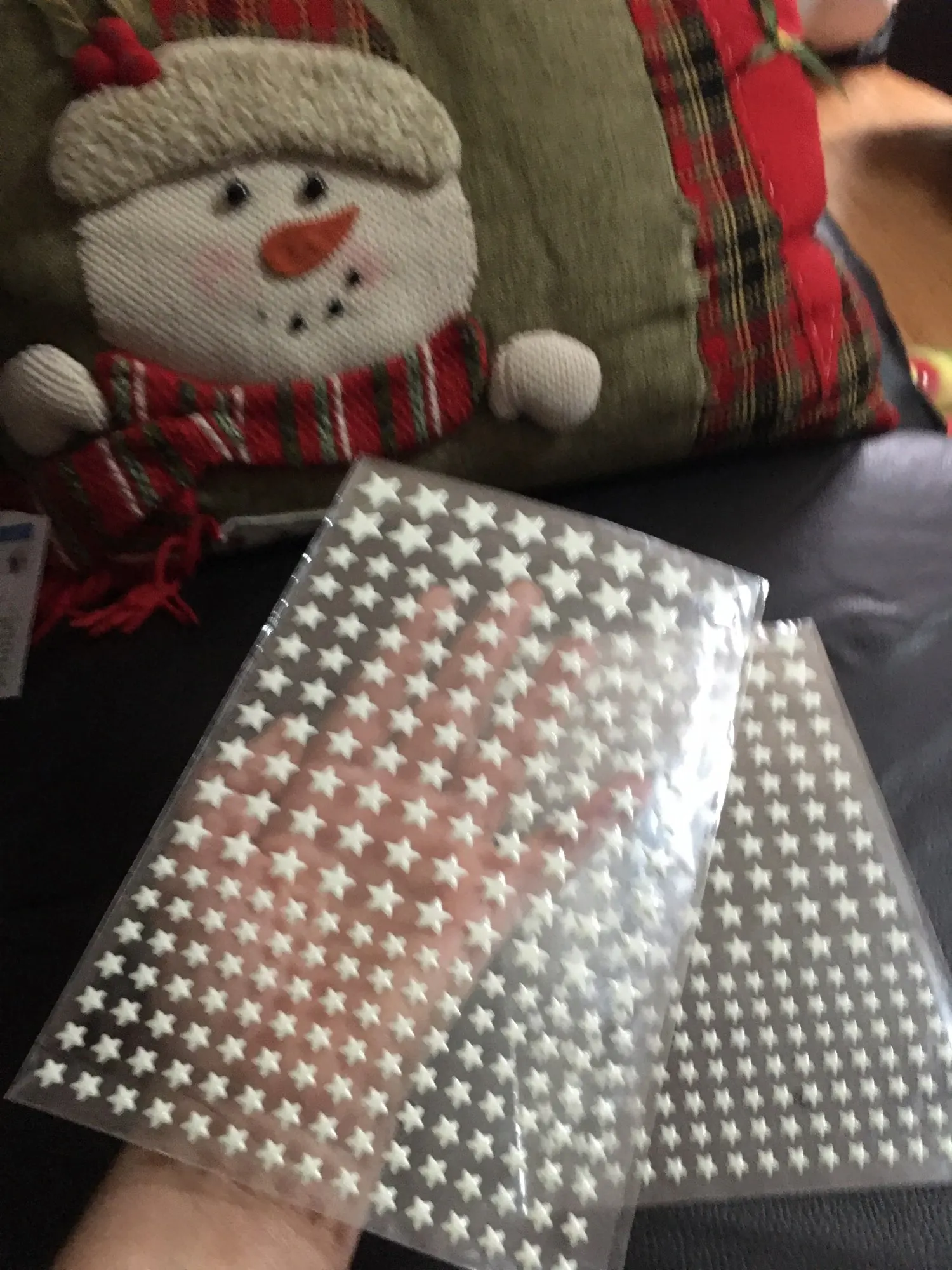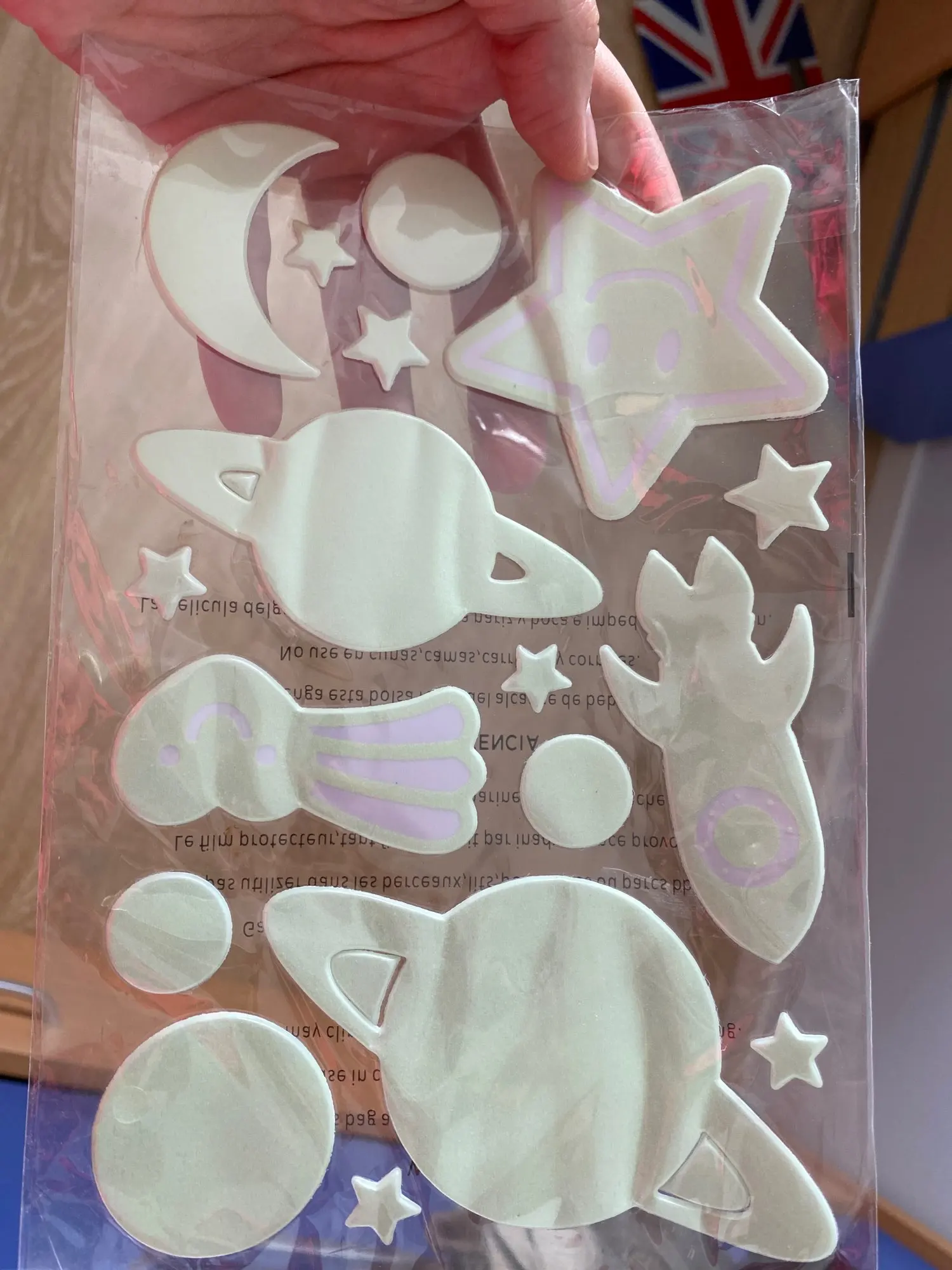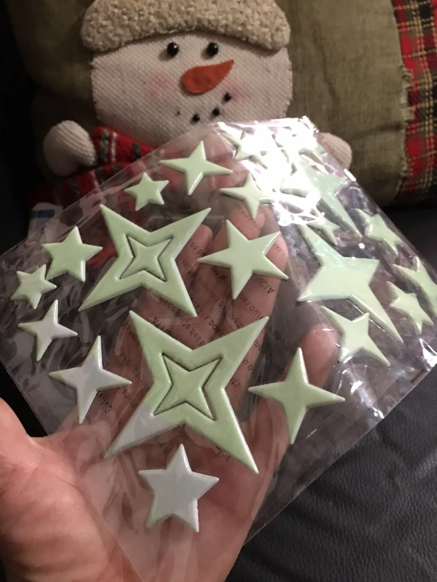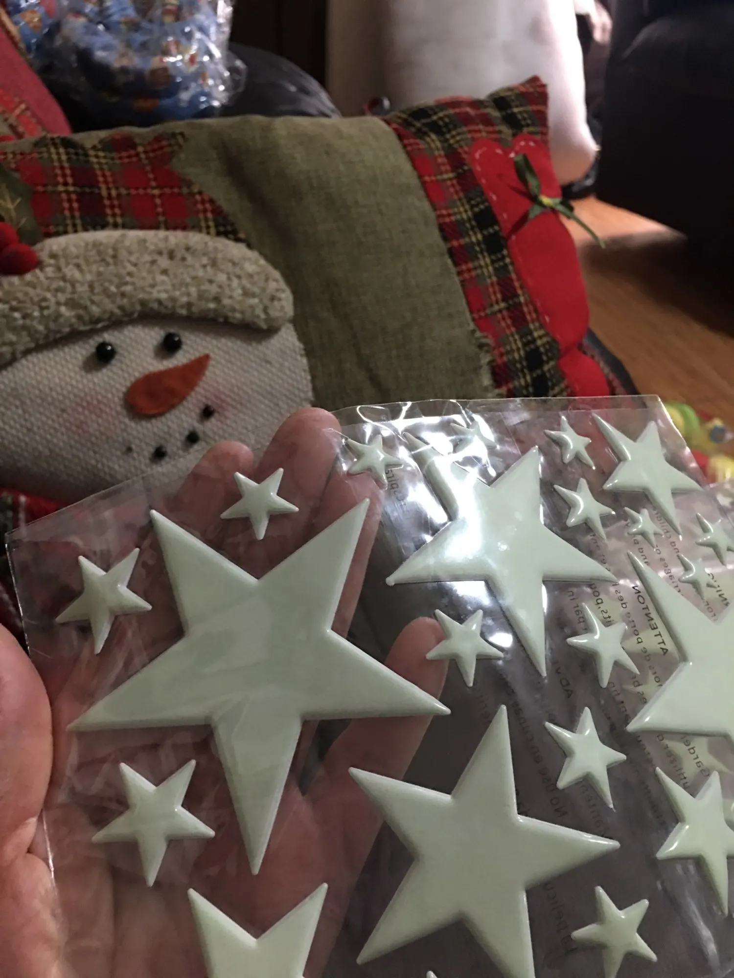 Пришли конечно мятые((( но мы их под пресс на пару дней и они выправились. На обоях держатся слабо, а вот на покрашенной стене водоэмульсионкой - отлично!!! Снимутся только с краской (пробывали)))) светятся долго, до самого утра)) доставка суперрр быстрая 2-3 недели Кубань. Заказали ещё комплект для племянника! Оооочень рекомендую))