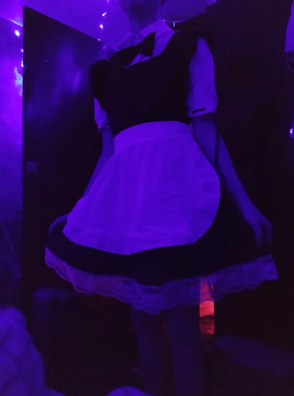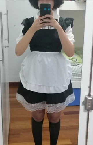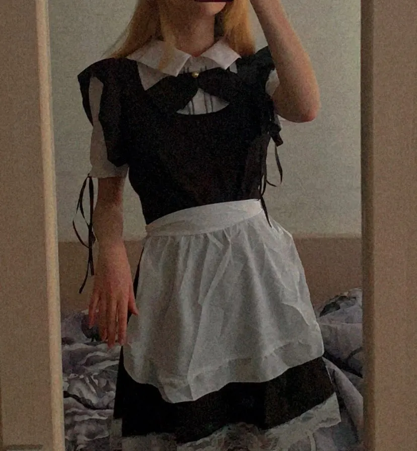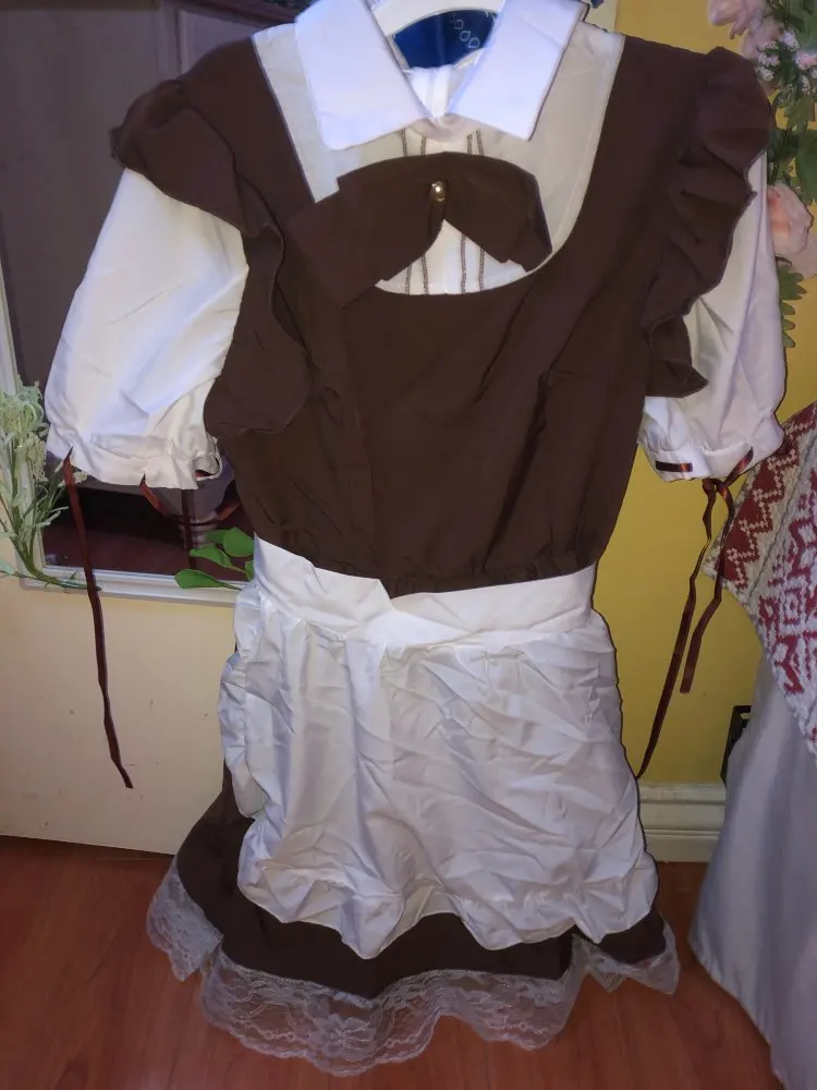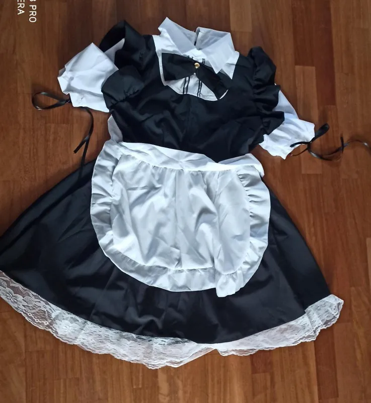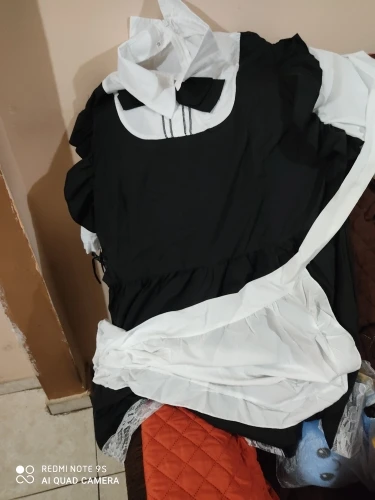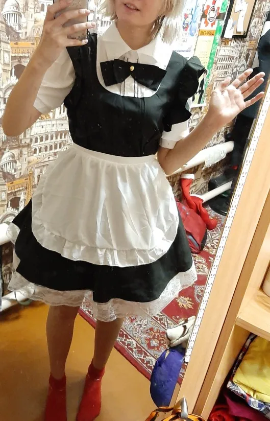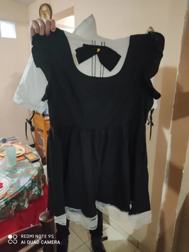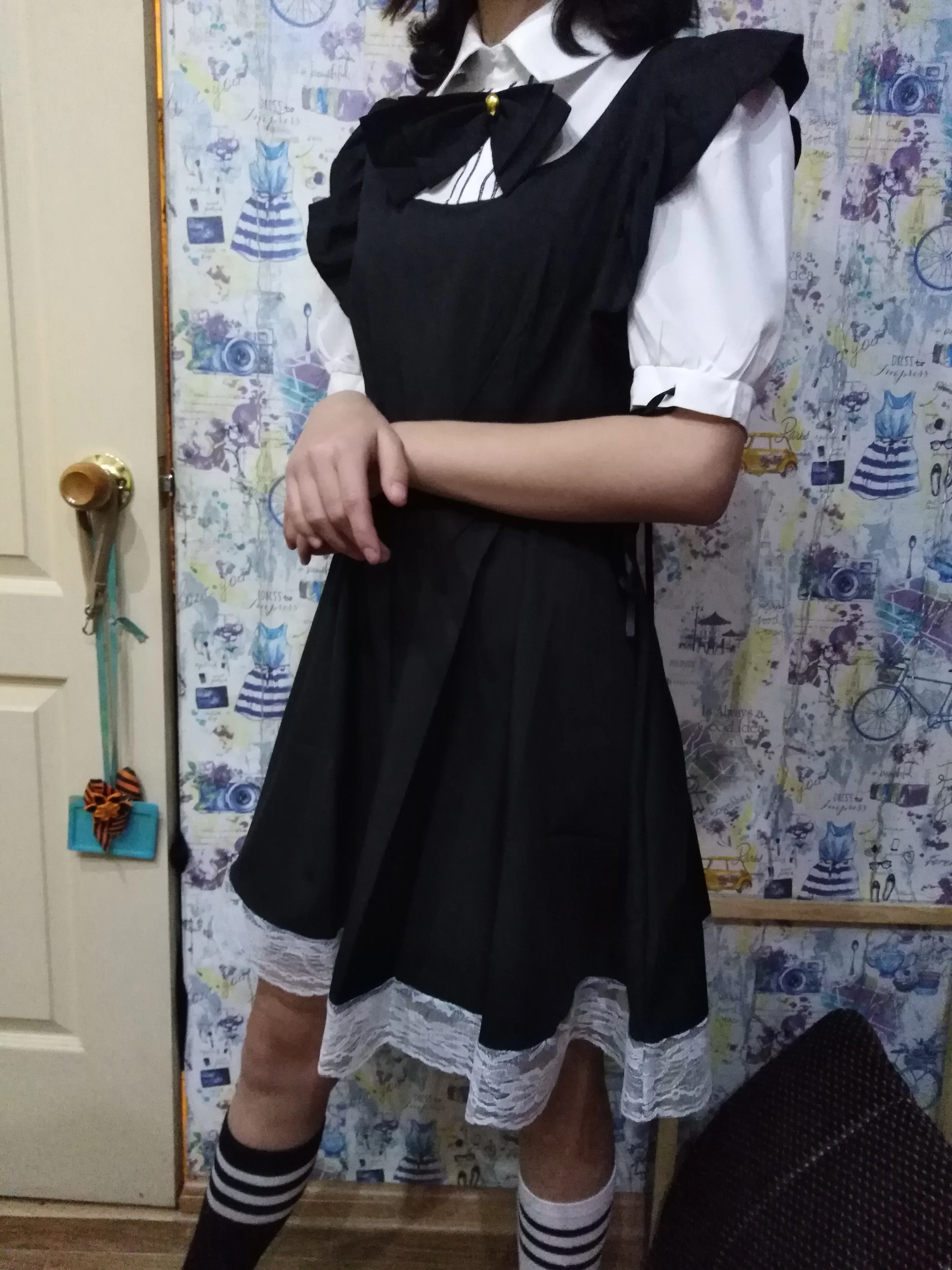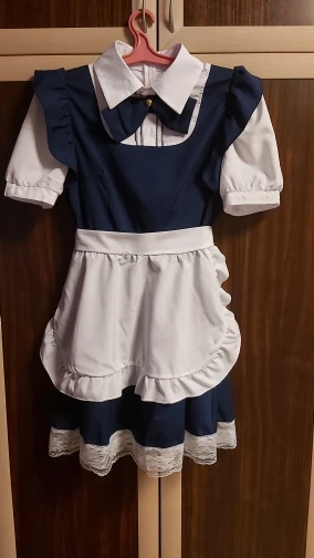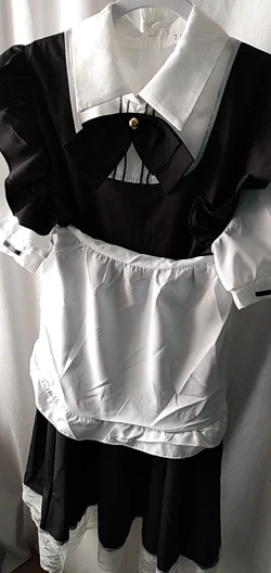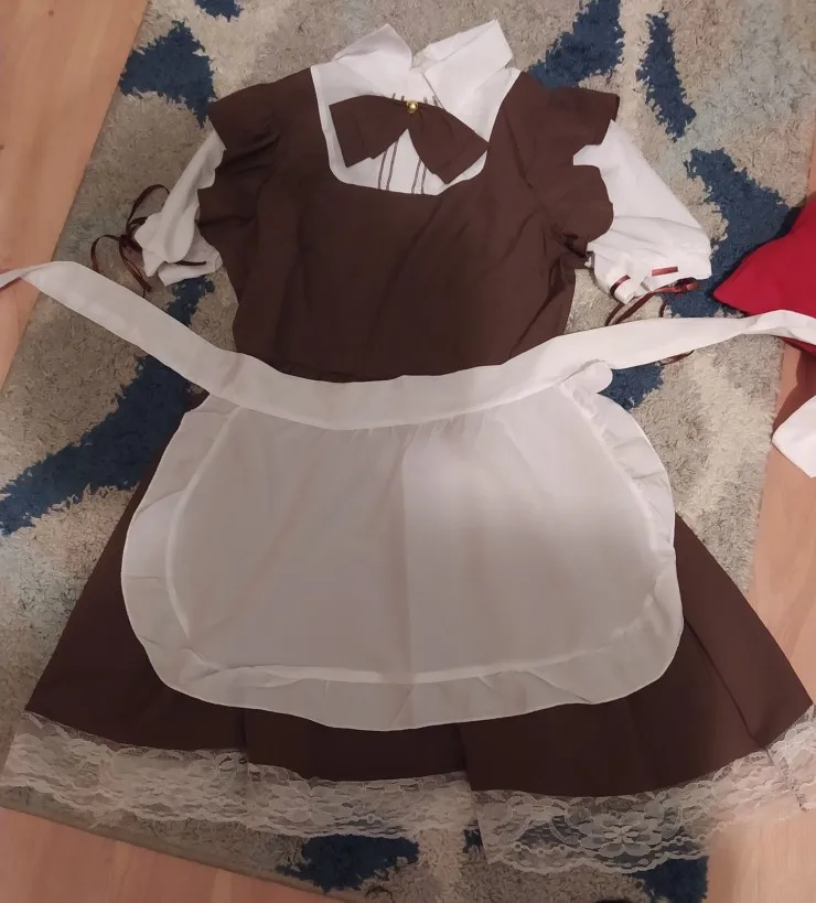 Костюм хорошо сидит, я получил 2XL. Белые секции имеют несколько сгибающихся линий, но это не то, что нельзя зафиксировать. Юбка немного плоская, но если у вас есть что-то, что вам нужно, она красиво затягивается. Фартук отделен от платья, но все остальное соединено.