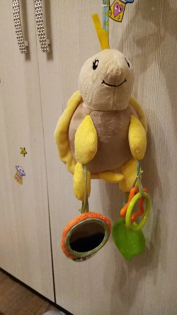 Черепашка красивая, сшита хорошо (только на панцире полосатая ткань тонкая. Петли побежали), мордочка вышита аккуратно. Погремушка звонкая , зеркальце покрыто плёнкой для транспортировки. Прорезыватель из простого пластика (не силикон), то очень жаль. И плохо, что сама черепашка не шаршит, не брынчит, не звонит. Просто мягкая игрушка. У ребёнка (6 мес) самое любимое - это зеркальце, обсасывает с удовольствием!