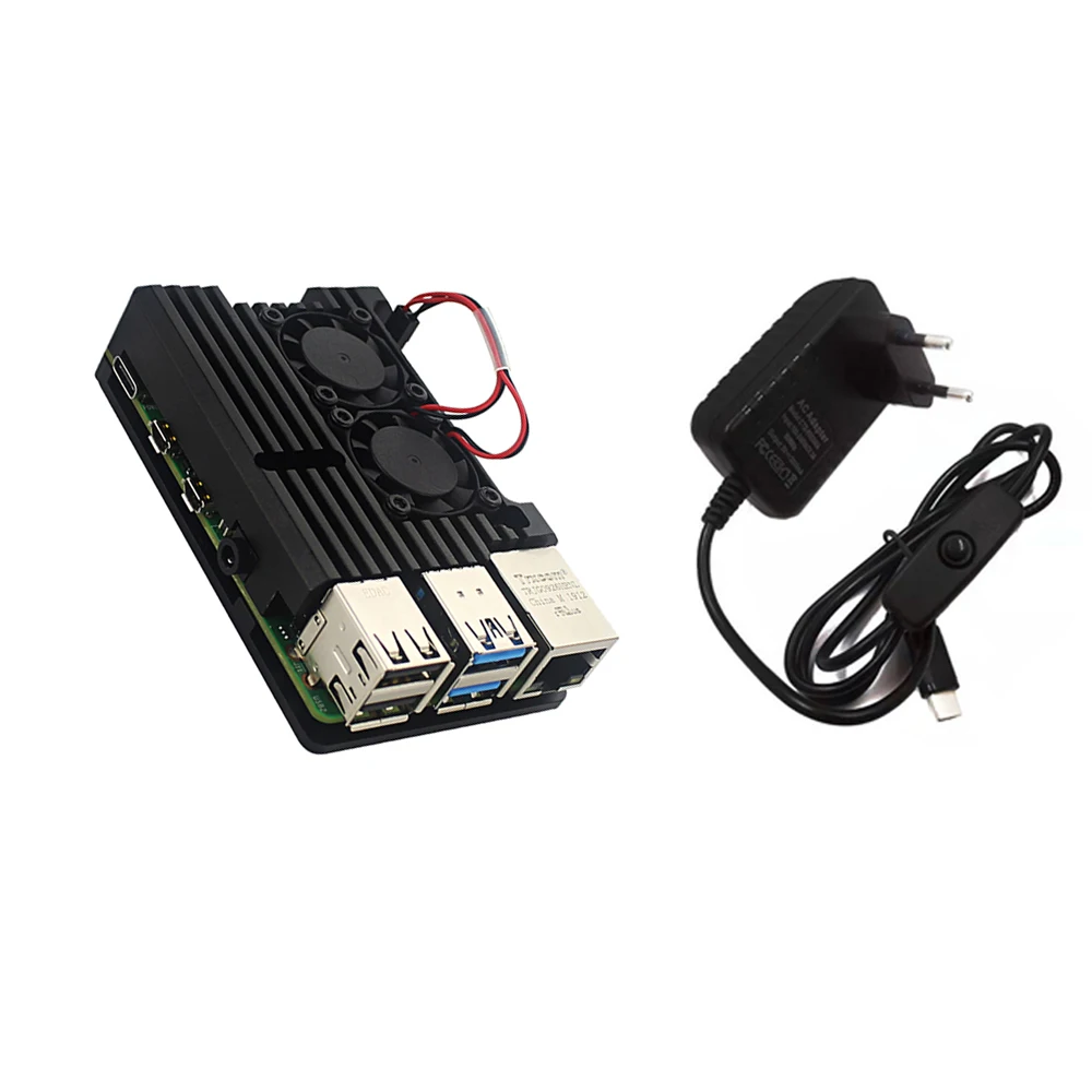 Чехол для Raspberry Pi 4 4B + адаптер питания для Raspberry Pi 4, алюминиевый корпус CNC, теплоотвод, охлаждающий вентилятор для Raspberry Pi 4, Модель B