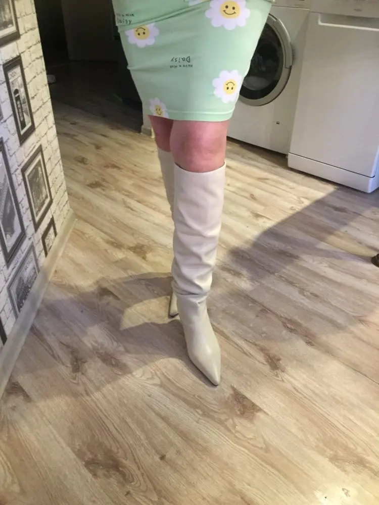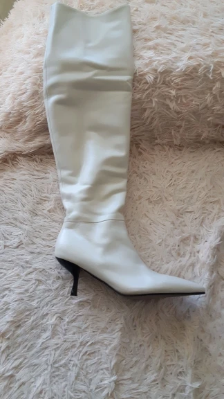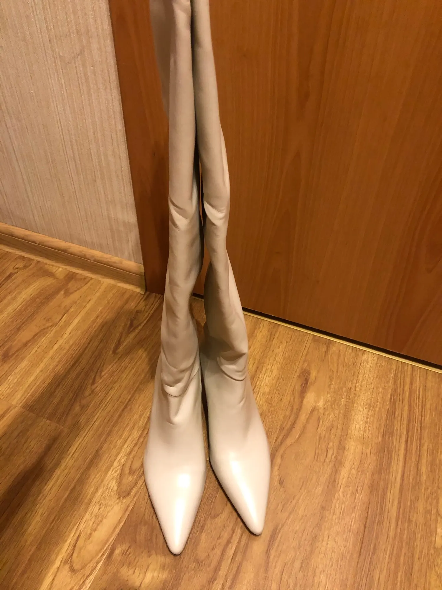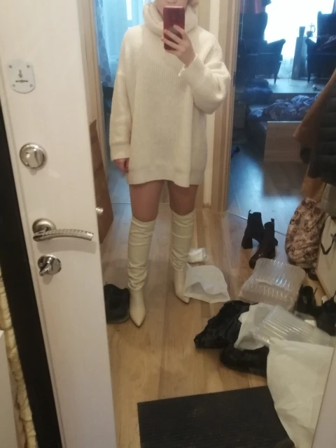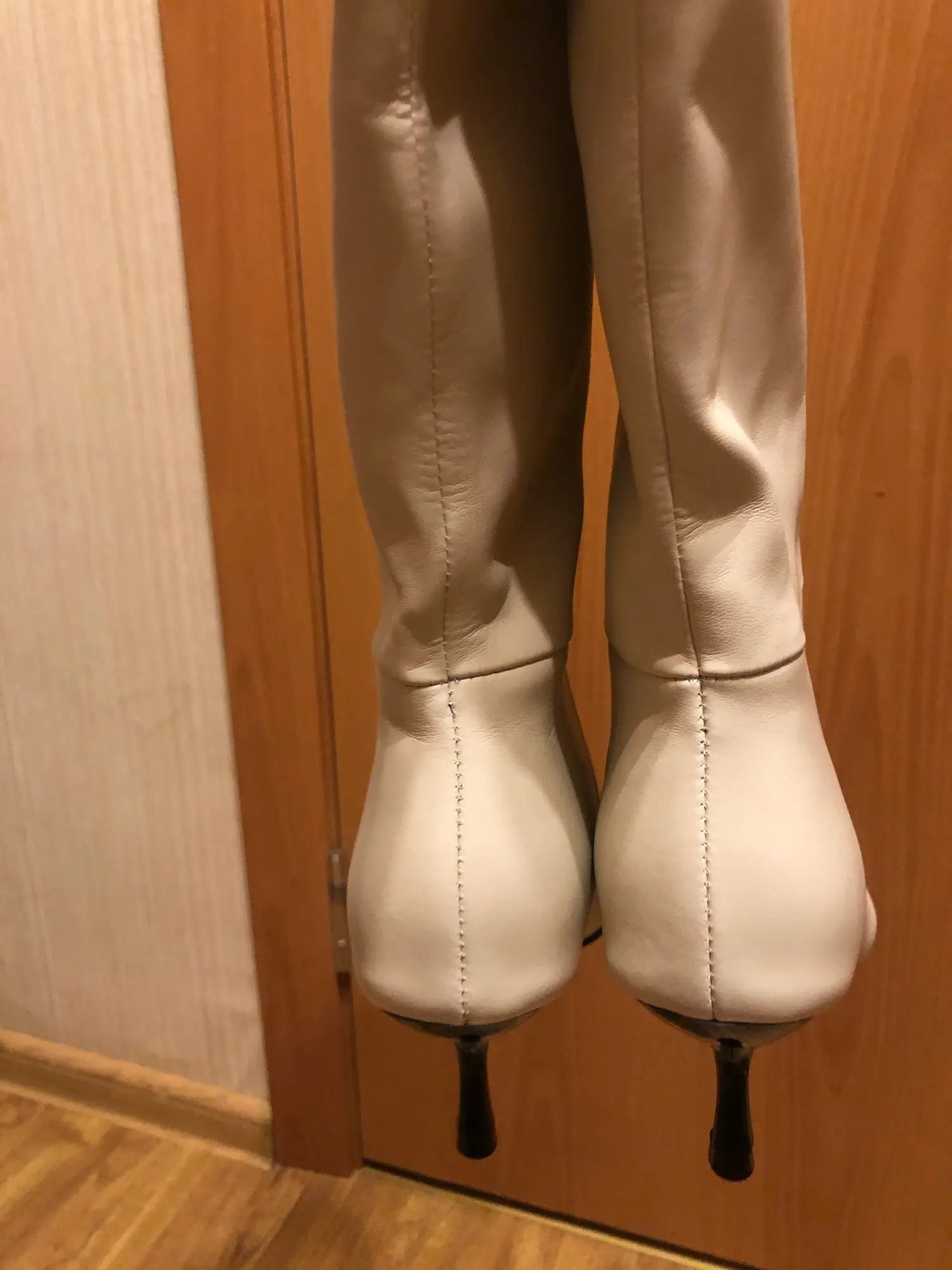 Сапоги классные. Но на очень худую и узкую ногу. У меня пухлые колени и поэтому если присмотреться на фотографиях, то видно беду. Обхват колена 38 см. А так очень красивые, без молнии, сделаны качественно. Цвет молочный. Очень переживала, что цвет белый, но нет, молочный цвет, очень приятный