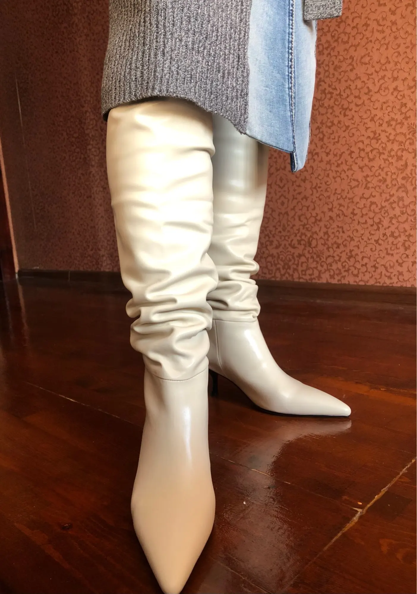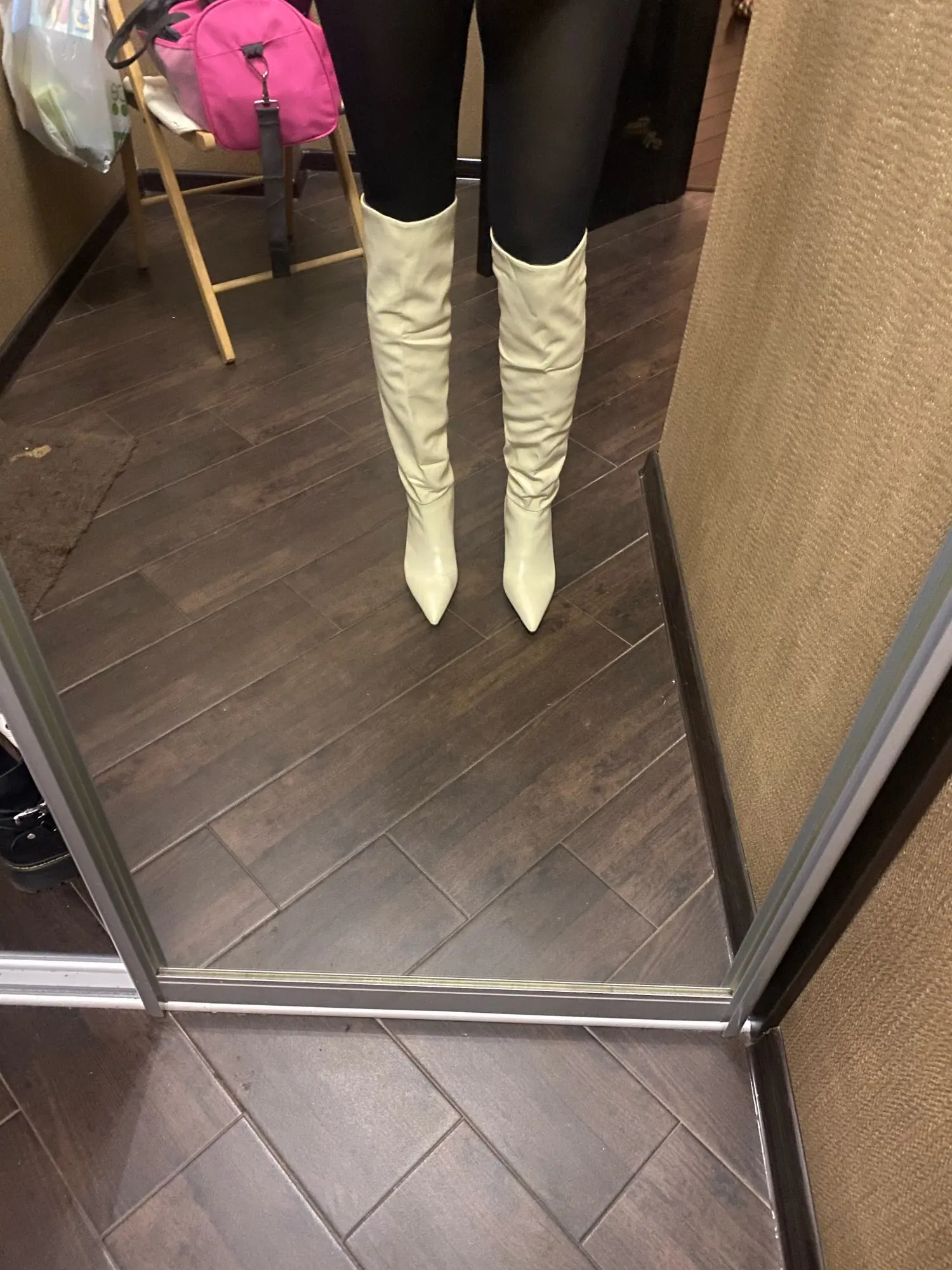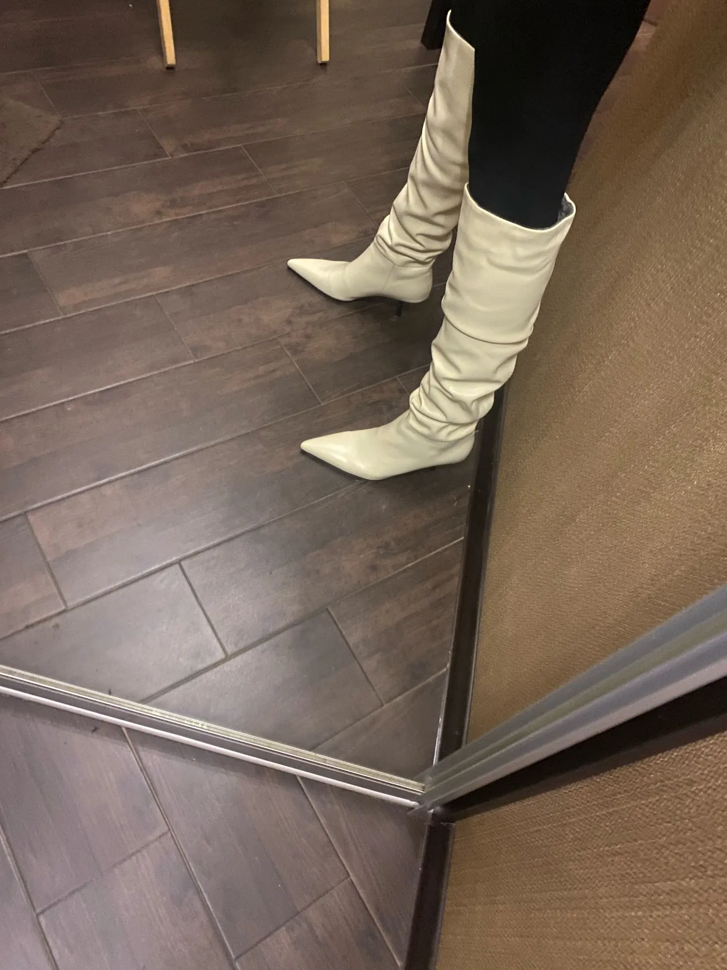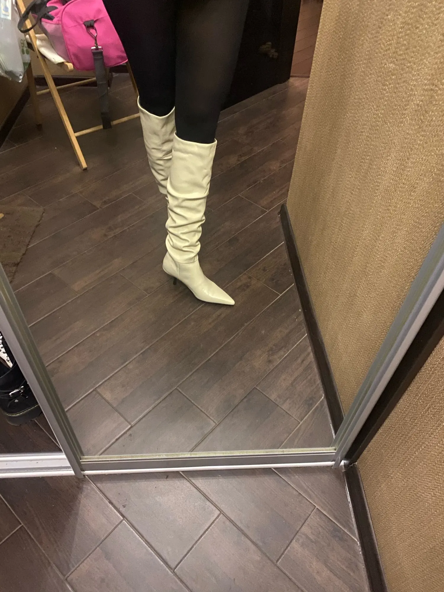 Сапоги классные. Но на очень худую и узкую ногу. У меня пухлые колени и поэтому если присмотреться на фотографиях, то видно беду. Обхват колена 38 см. А так очень красивые, без молнии, сделаны качественно. Цвет молочный. Очень переживала, что цвет белый, но нет, молочный цвет, очень приятный