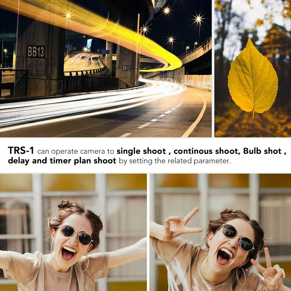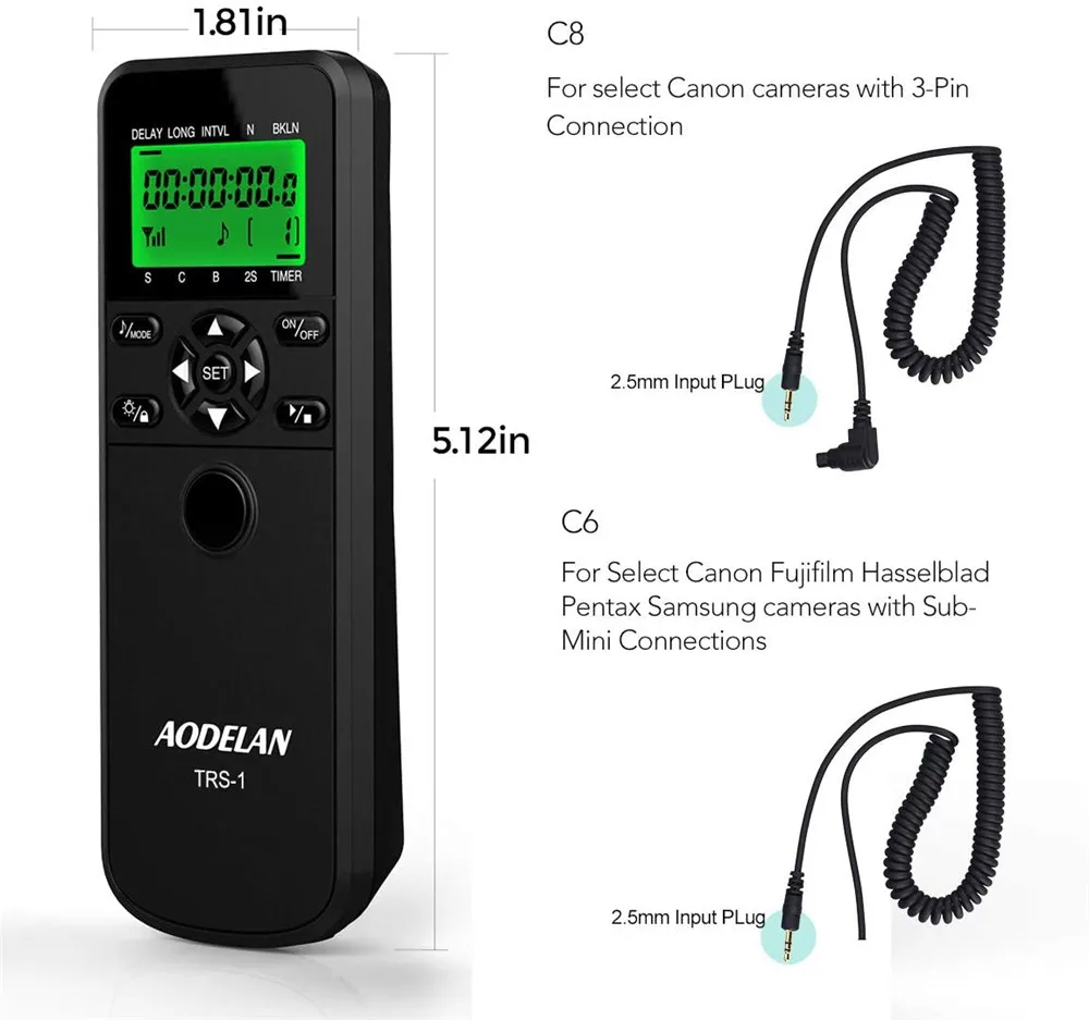 TRS-1 AODELAN будет работать как таймер и дистанционный спуск затвора. Помимо полных функций спуска затвора, он также имеет функции размножения таймера: Таймер задержки, таймер длительного экспозиции, интервальный таймер, а также настройки количества экспозиции; его временные параметры может быть с точностью до 0,1 секунд. TRS-1 отлично подходит для временной записи цветущих цветов, астрофотографии и т. д.