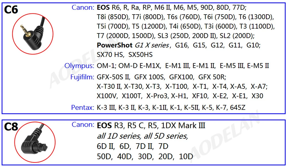 Canon EOS R, EOS RP, 90D, Canon Rebel XT, XTi, XS, XSi, T1i, T2, T2i, T3, T3i, T4, T4i, T5, T5i, T6, t6i, T7i, SL1; Canon EOS 800D, 200D, 80D, 70D, 77D, 60D, 60Da, 760D, 750D, 700D, 650D, 600D, 550D, 500D, 450D, 100D, 1300D, 1200D, 1100D, 1000D, 2000D, M5, M6;PowerShot SX60 HS, G1X, G1X Mark II, G1X Mark III, G3 X, G5 X, G10, G11, G12, G15, G16Canon EOS M6 Mark II, EOS 6D MARK II, 1D X MarkII, 1D X, 1DS Mark III, 1DS Mark II, 1Ds, 1D Mark IV, 1D Mark III, 1D Mark II N, 1D Mark II, 1D, EOS D2000, 5D Mark II, 5D Mark III, 5D Mark IV, 5DS, 5DS R, 5D, 6D, 7D, 7D Mark II, 50D, 40D, 30D, 20D, D60, D30, EOS-1V, EOS-3Olympus E-M1 MARK II. Pentax * ist D, * ist DL, * ist DS, * ist DS2, K100D, K110D, K200D, K-500, K100D, K20D, K10D, K-30, K-50, K-7, K-5, k-5II, K-5IIs, K-3, K-3II, K 1;Samsung GX-1L, GX-1S, GX-10, GX-20, NX100, NX11, NX10, NX5;Fujifilm GFX 50R, X-T3, X-E1, XF10.Contax 645, N1, NX, N Digial;Sigma Sd1