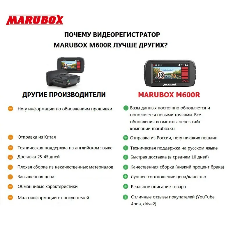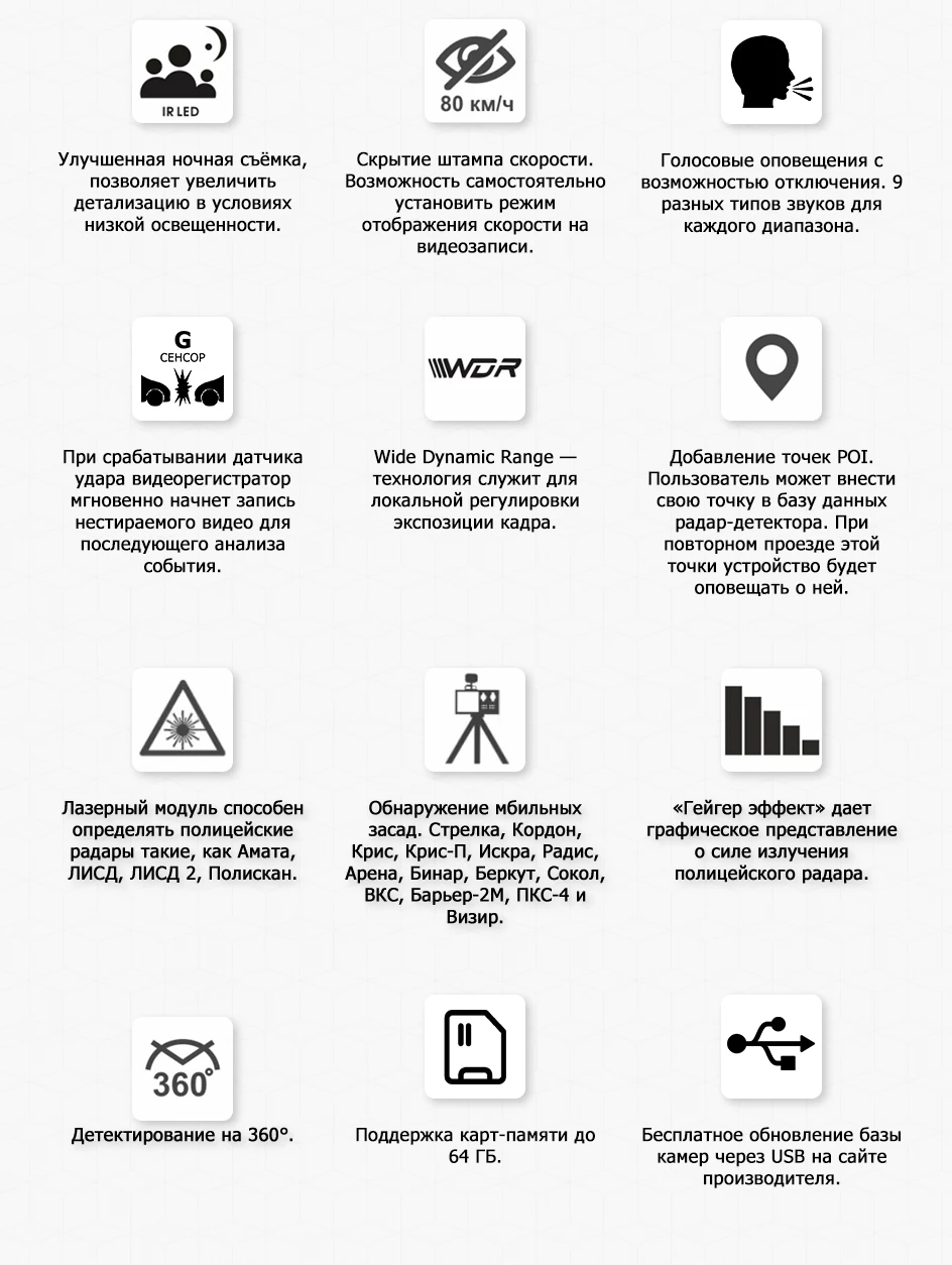+ инструкция на русском языке + ОЧЕНЬ хорошее крепление к стеклу + интуитивно понятный интерфейс + время доставки 7 дней + имеет контроль полосы + можно устанавливать свои тревожные точки + и - обновление базы с официального сайта, только там обновлений много я еще не разобрался какое именно скачивать. - многие радары триноги не видит - много ложных срабатываний - включается через две - три минуты после включения зажигания (первое время напрягало, потом привык) ИТОГ. Покупке рад, продавец молодец. -