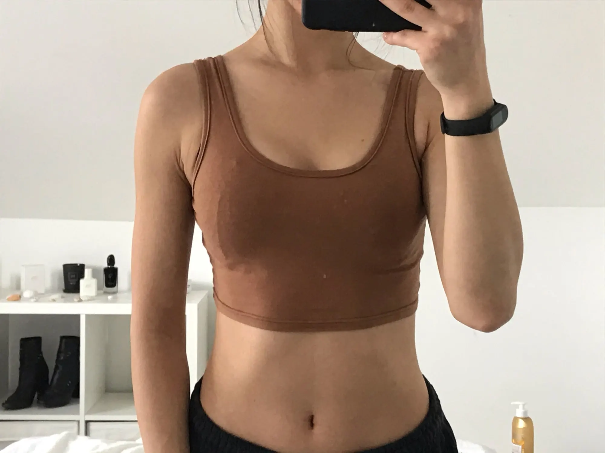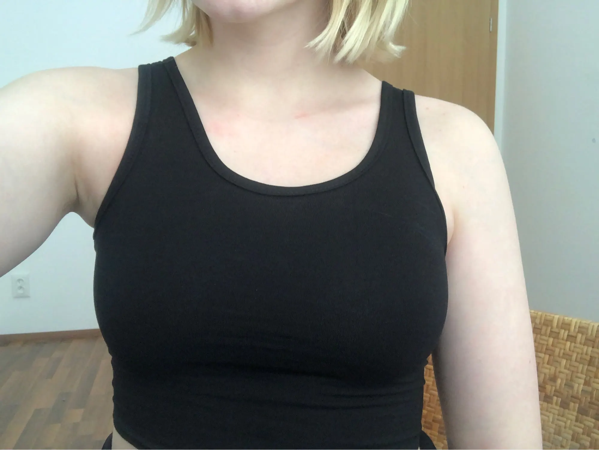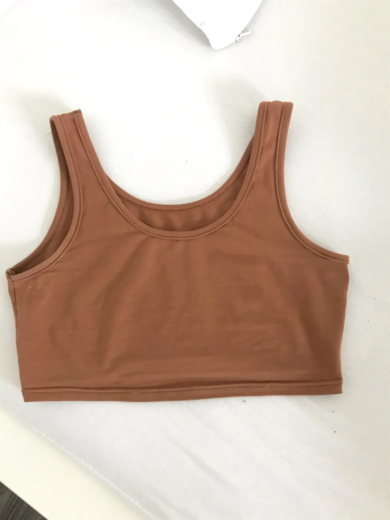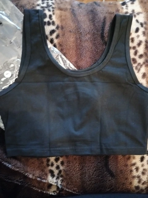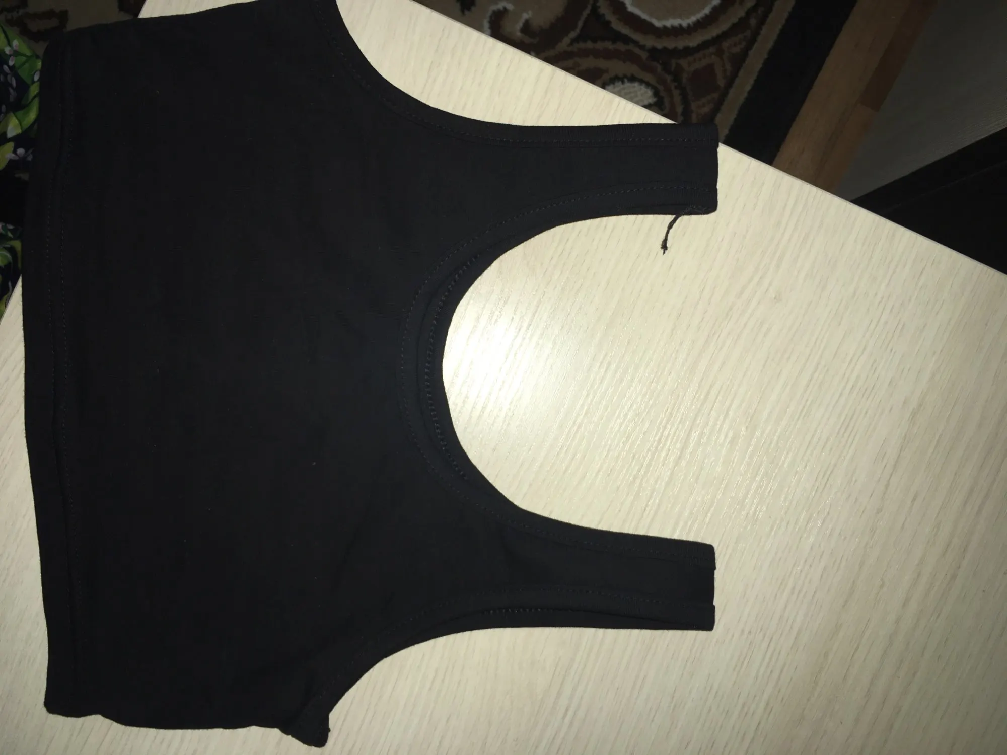 Для своей цены товар хороший, чуть торчат нитки, запаха нет, еластичный на ОГ 90 отлично подошел, впритык, черный насыщенный цвет. Класно сидит на теле. Минусы: - не ровно прошито правое плечо, на фото ниже видно, но это можно исправить.