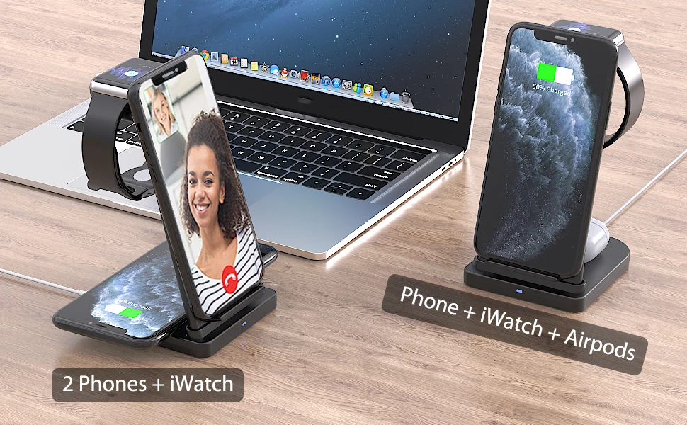【Все в одном беспроводном заряде 】:3 в 1 встроенная беспроводная зарядная док-станция для iphone, другие телефоны, которые поддерживают зарядку QI, AirPods 2, AirPods Pro и Apple Watch Series 7/6/SE/5/4/3/2. Он может заряжать телефон. Нет необходимости в любых грязных зарядных кабелях, сделайте ваш стол более простым и аккуратным.