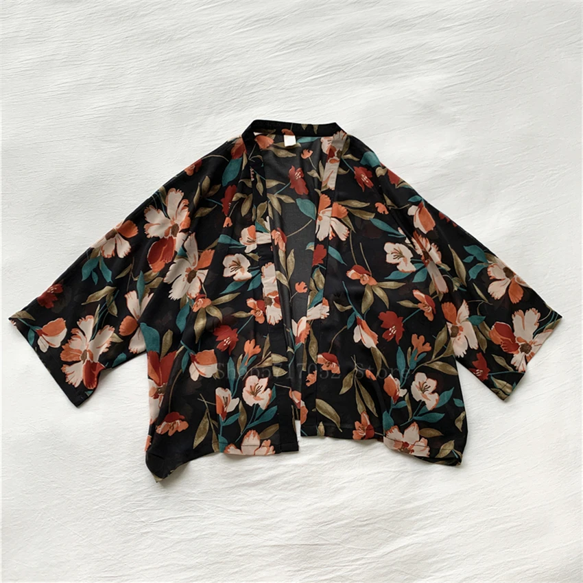 Женский кардиган в стиле Харадзюку, японское кимоно, летняя Свободная блузка с цветочным принтом, тонкое прозрачное солнцезащитное пальто, одежда юката, один размер