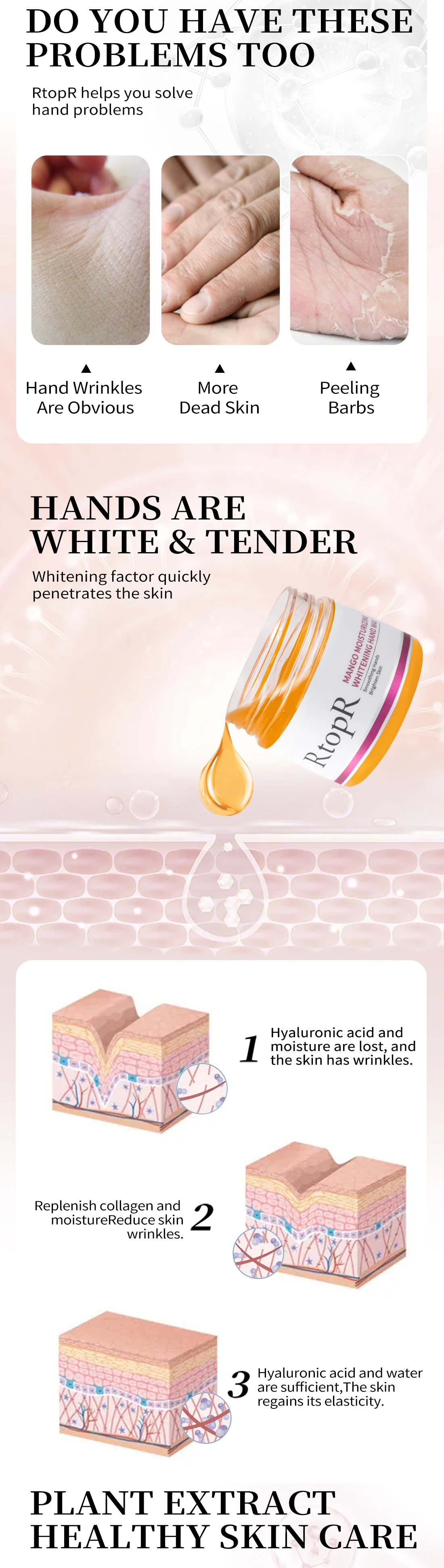 Эссенция манго интегрирует несколько питательных веществ, образуя увлажняющую и питательную восковую пленку на руках, мягко и интенсивно питает руки, смягчает сухие, грубые, треснутые и тусклые условия кожи. Кроме того, может помочь удалить старую и старую кутин, нежную и яркую кожу, и сделать руки блестящими и блестящими.