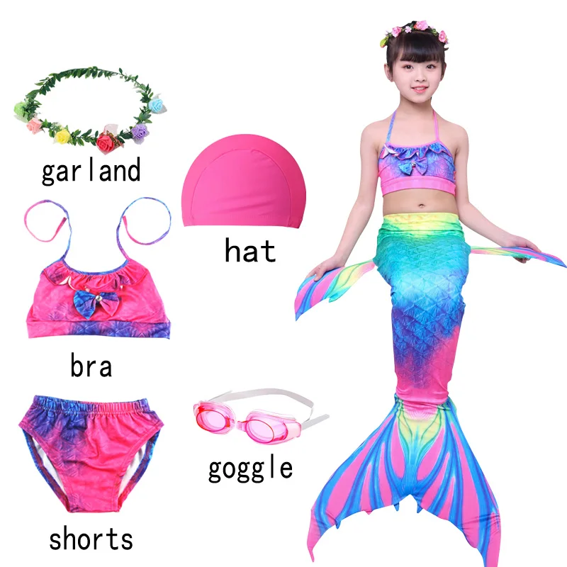 Бесплатная доставка, разноцветный купальный костюм русалки с бюстгальтером для девочек, Детский костюм Ариэль, хвост русалки, купальник.
