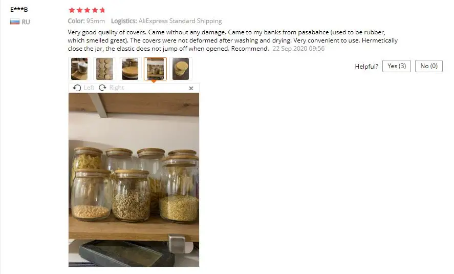 Тут тоже самое, доставкой и качеством доволен! Но размеры подвели. Горловина банок , внутренний размер см.на фото 80мм , внутренний размер силикона 80мм,а внутренний размер крышки по дереву 70мм. Соответственно крышка болтается , силикон тонкий, жидкость держать не будет, чисто от пыли. И непосредственно магазину: делайте обзор продукции более полным. Спасибо!