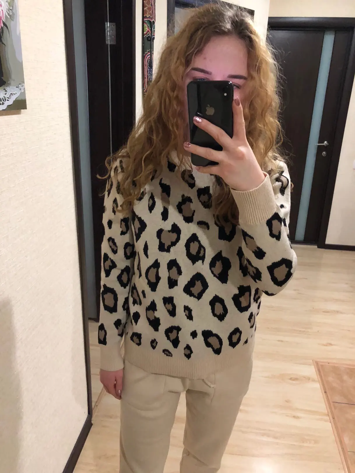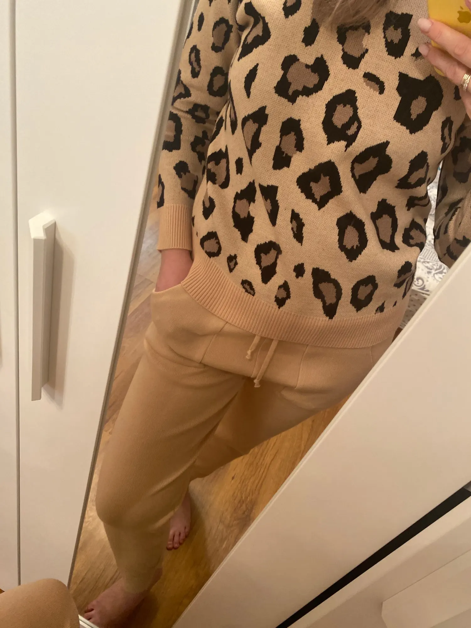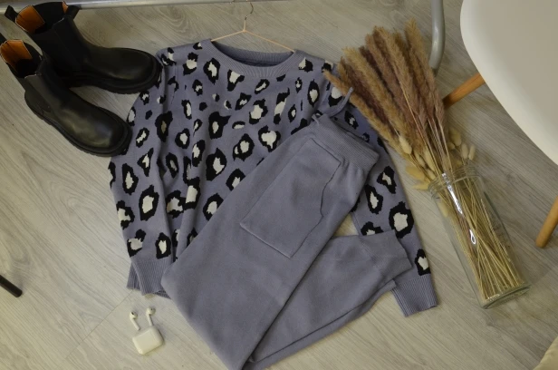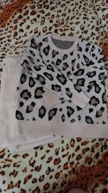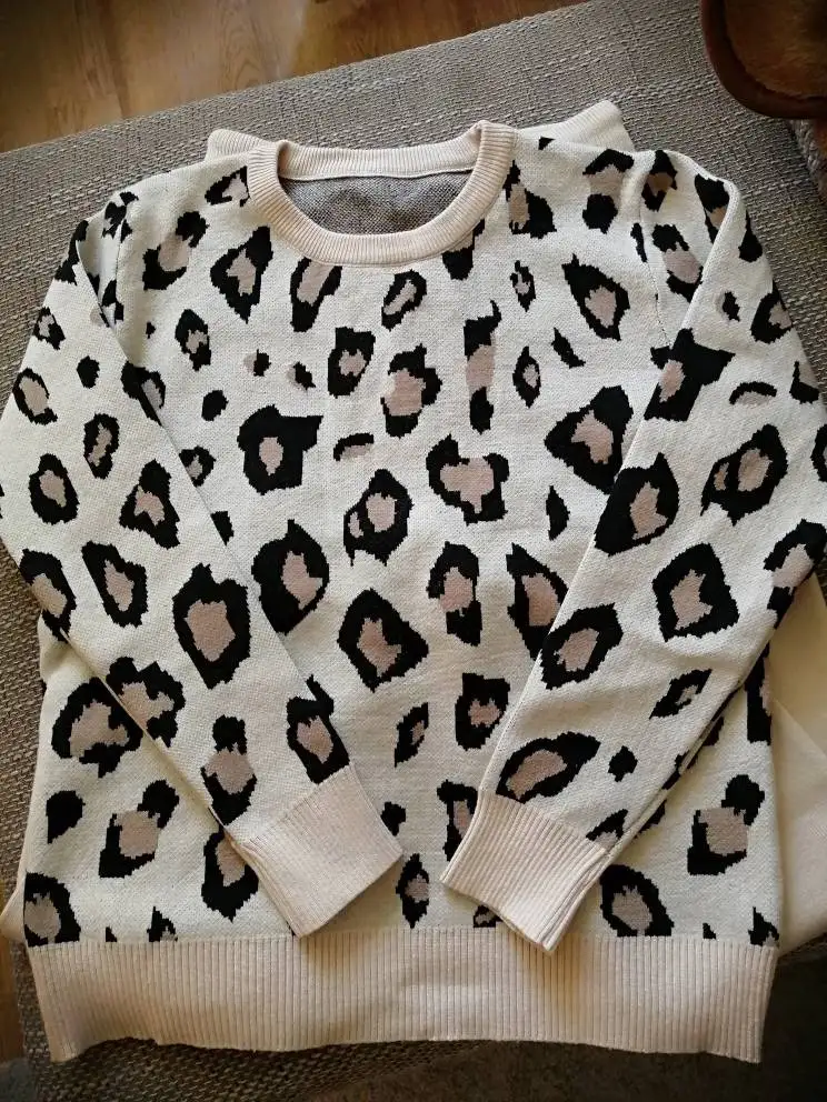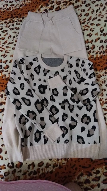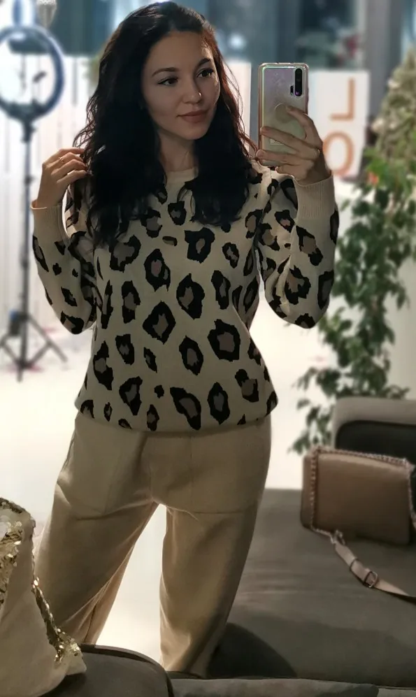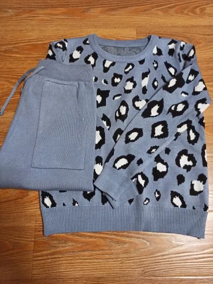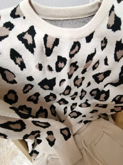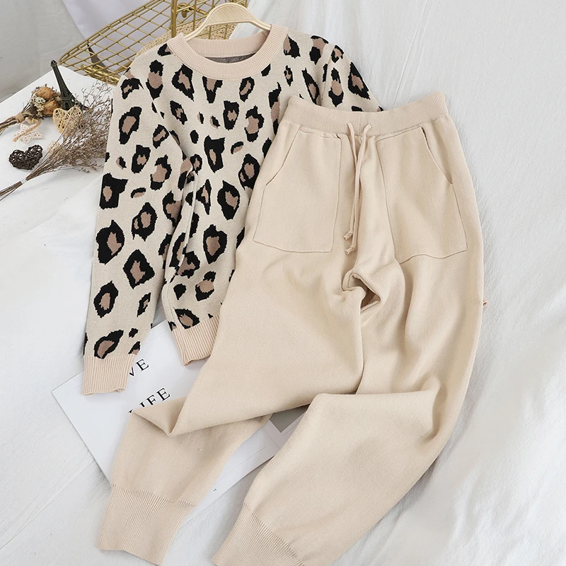 Женские трикотажные Ретро костюмы, Леопардовый свитер с длинным рукавом и круглым вырезом + шаровары со шнуровкой на талии и карманами, корейские комплекты
