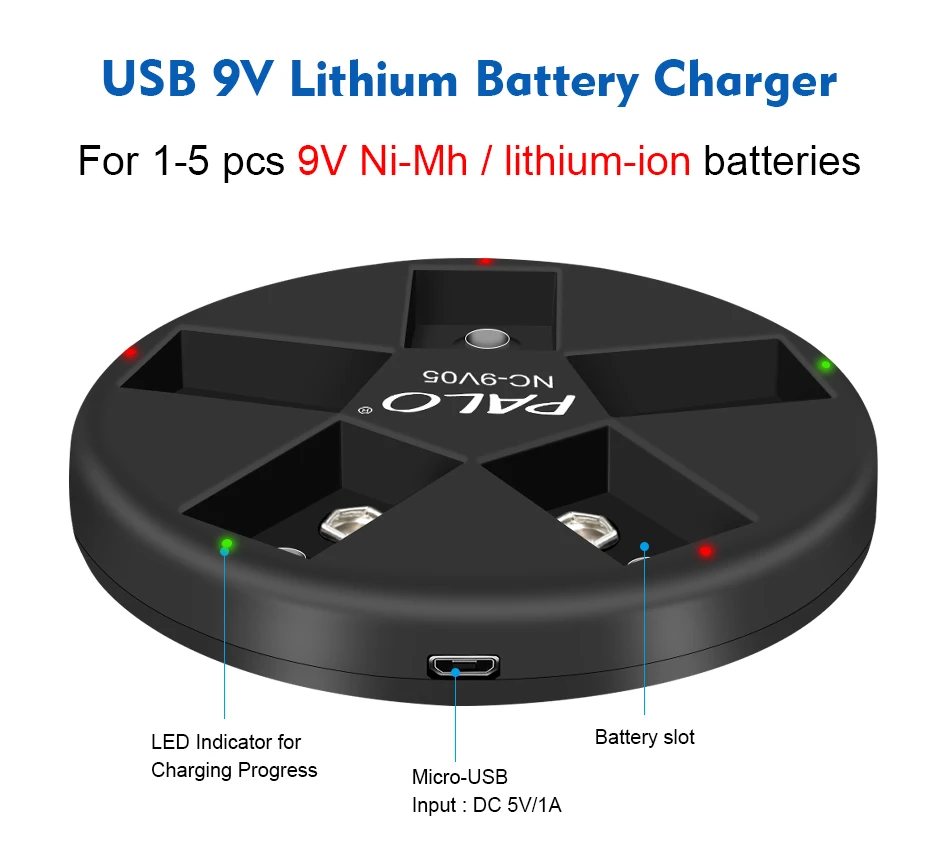 Спецификация9В литий-ионный Тип/никель-металл-гидридных аккумуляторных батарей зарядное устройство-Ultra fit для 1/2/3/4/5 9В литий-ионный Тип/никель-металл-гидридных аккумуляторных батарей.Лучший выбор для путешествий-мини и Портативный USB зарядное устройствоПора попрощаться с адаптером переменного тока и розеткой переменного тока при зарядке аккумуляторов.Уникальный дизайн USB свободно совместим со всеми устройствами 5 В USB, такими как внешний аккумулятор, адаптер, солнечное зарядное устройство и т. Д.Умное и скоростное зарядное устройство USBМощность на входе: 5В/1AВыход: 8,4 в постоянного тока/250 мА9 в DC/80 мАУдобный светодиодный индикатор хода зарядкиКрасный мигание означает зарядку; Зеленый свет означает полную зарядку.(Без нагрузки без света)Изготовленное зарядное устройство для аккумулятора обеспечивает безопасность* Интеллектуальное управление с передовой системой MCU, △V и-△V отключается метод зарядки, автоматически останавливает зарядку при полной зарядке.* Защита от короткого замыкания, защита от обратной полярности и обнаружение перегрева для предотвращения перезарядки.* Особый режим зарядки обеспечивает максимальную емкость аккумуляторной батареи.