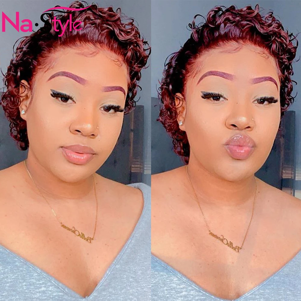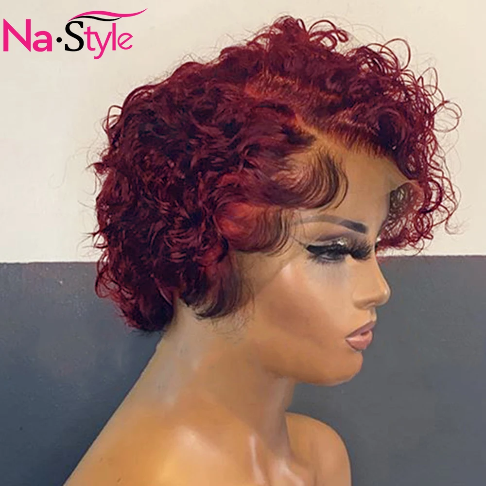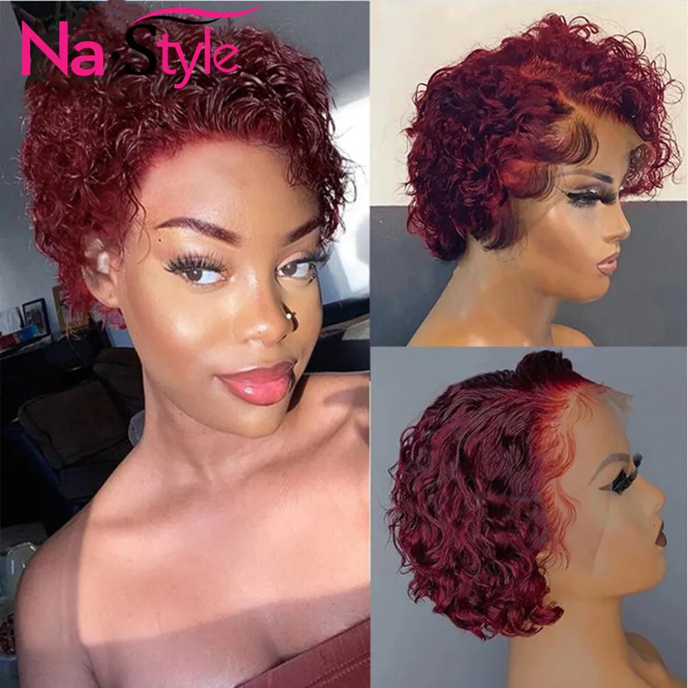 Парики из бордового кружева для женщин, красные вьющиеся человеческие волосы, парик, отбеленные узлы, глубокая сторона, Т-образная часть, короткий Боб, пикси, парик, Детские волосы 130, Remy