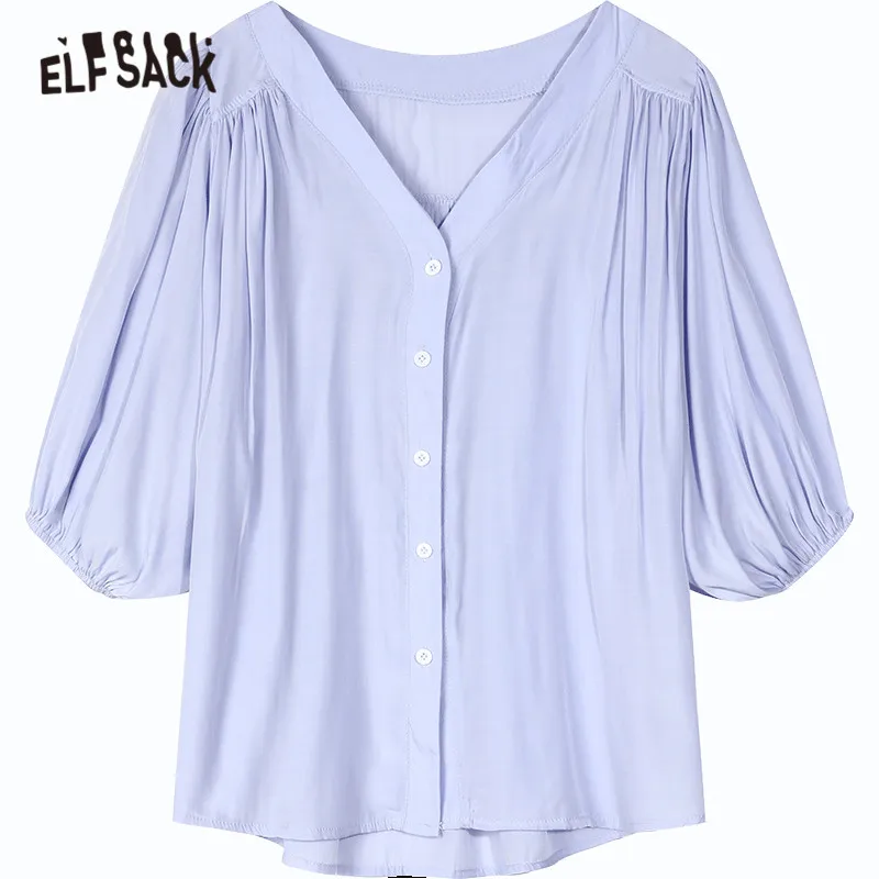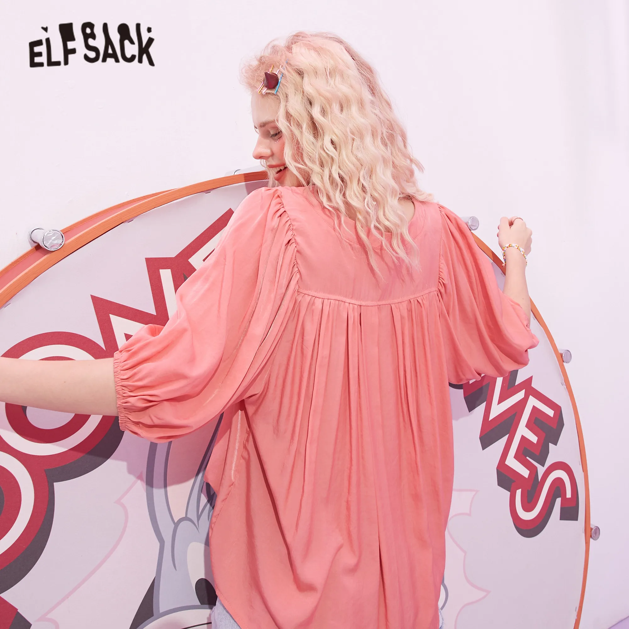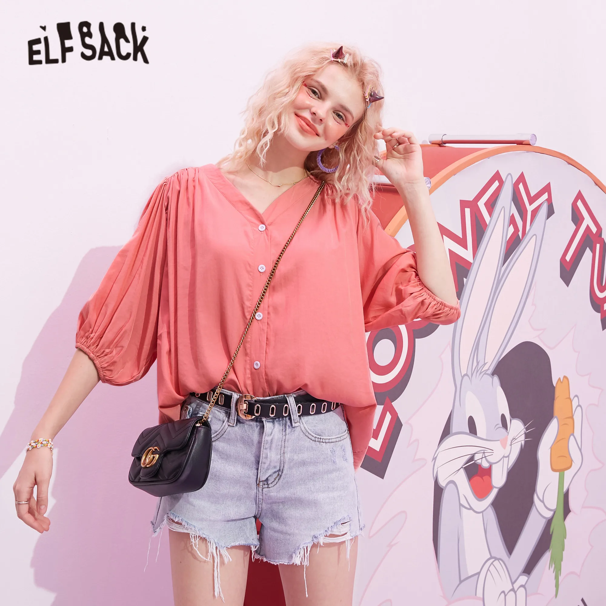 ELFSACKрозовые однотонные минималистичные повседневные женские рубашки, модель 2020 года, летний однобортный Женский Повседневный Топ с пышными рукавами в Корейском стиле