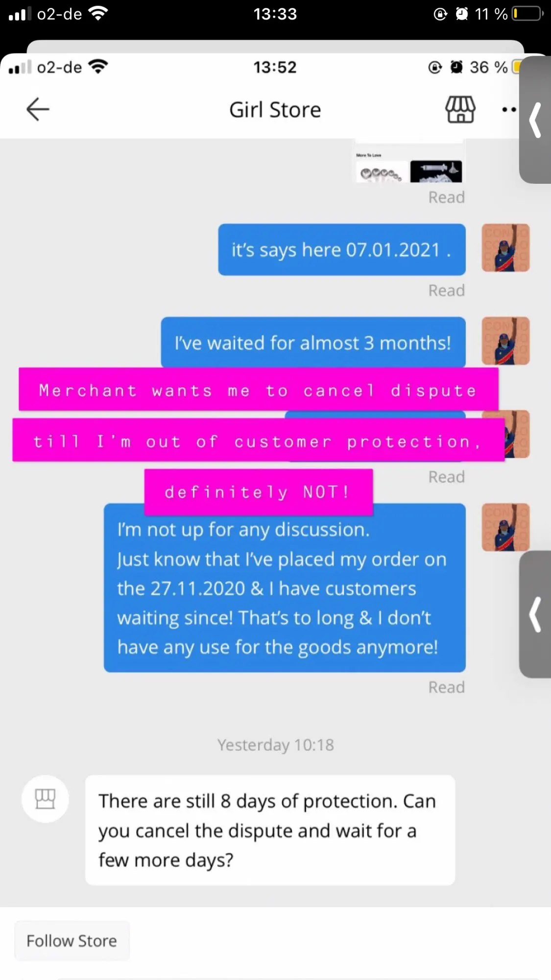 Самое лучшее обслуживание клиентов! Я разместил свой заказ 27 ноября 2020 года и сегодня 15 февраля 2021 года. Нет товаров, ложной информации и AliExpress закрыл мой спор без какой-либо информации, как указано. Я просто надеюсь, что кларна поможет мне. Как владелец бизнеса я очень разочарован. Мне действительно нужны товары. Я больше никогда не буду заказывать товары у поставщика AliExpress.