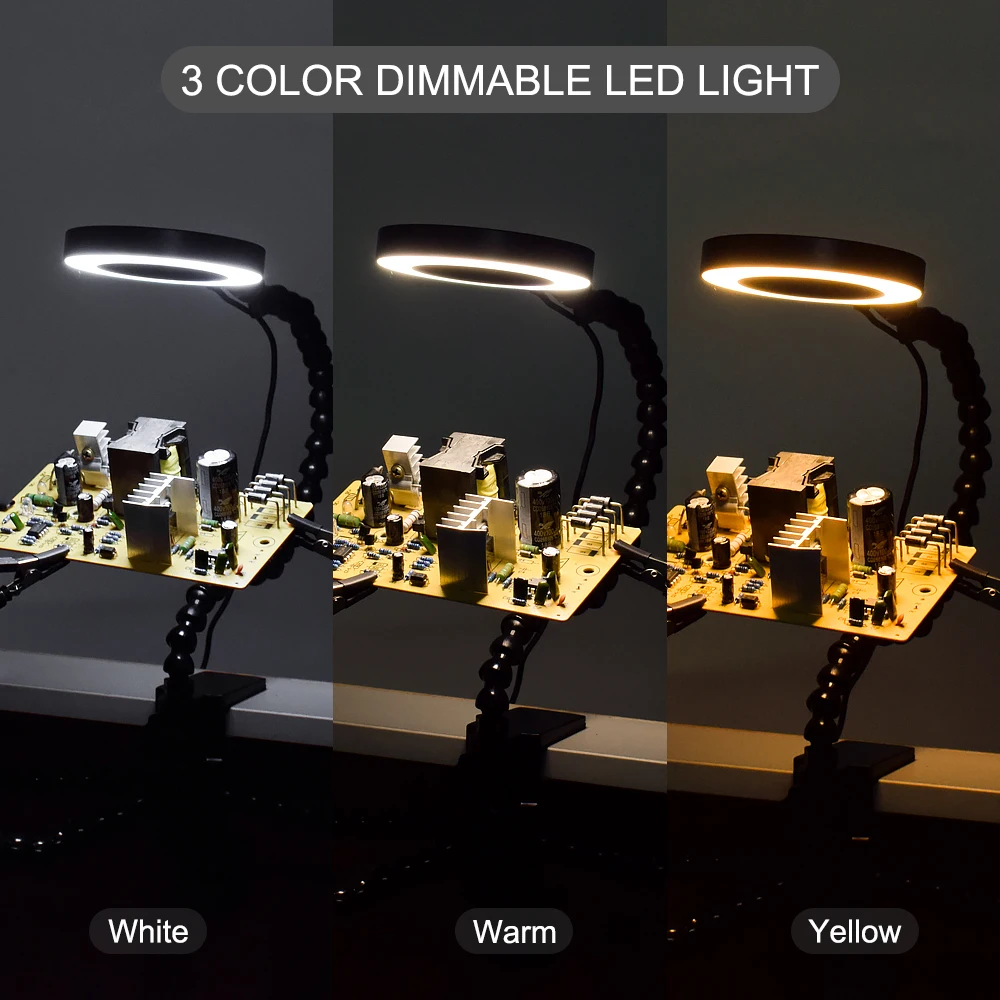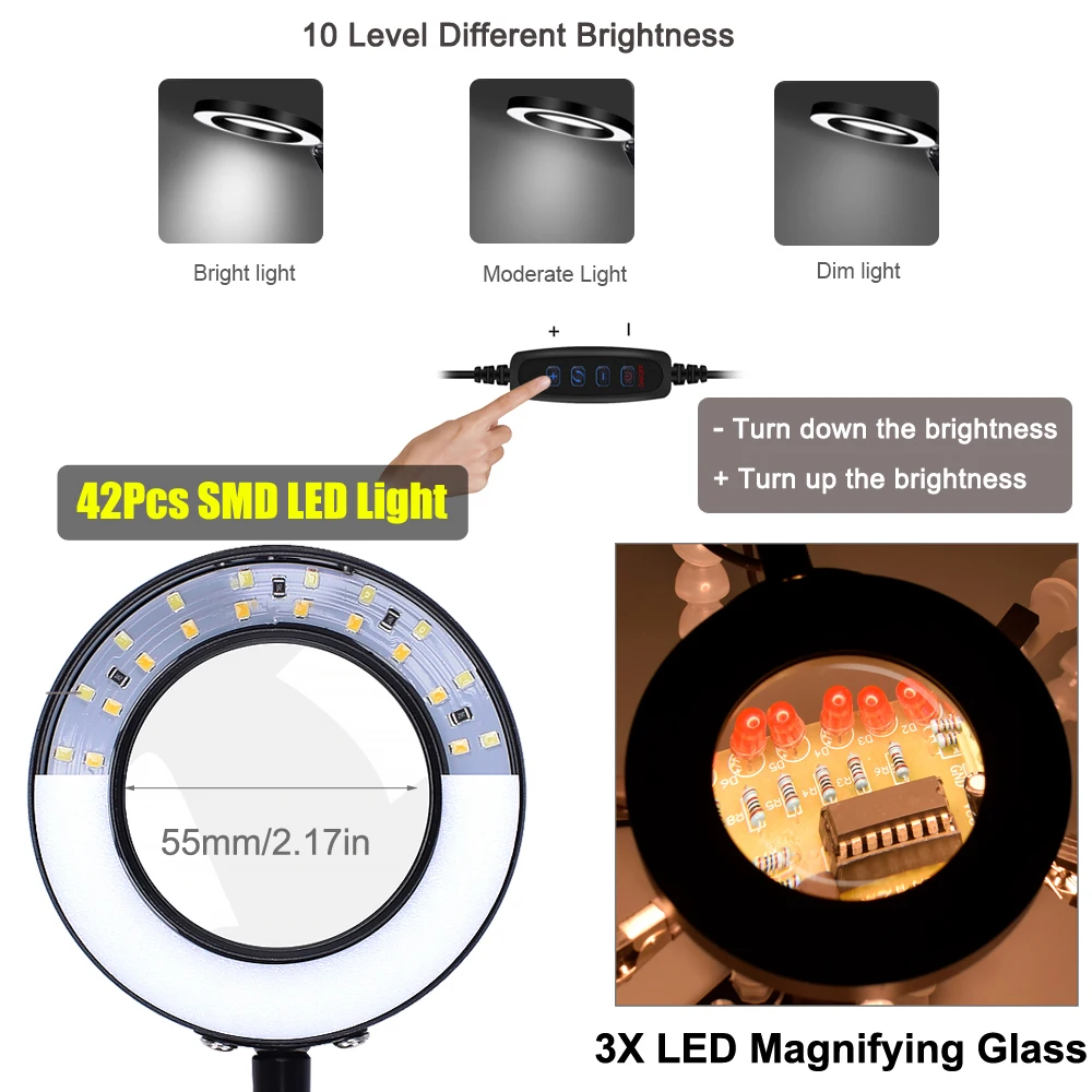 4. Увеличительное стекло USB 3X поможет вам сделать лучшую работу. Увеличительное стекло с светодиодный светильник, цветовая температура светодиодный светильник может быть скорректирована в 3 шага и яркость может быть скорректирована в 11 шагов, он может удовлетворить различные рабочие среды.