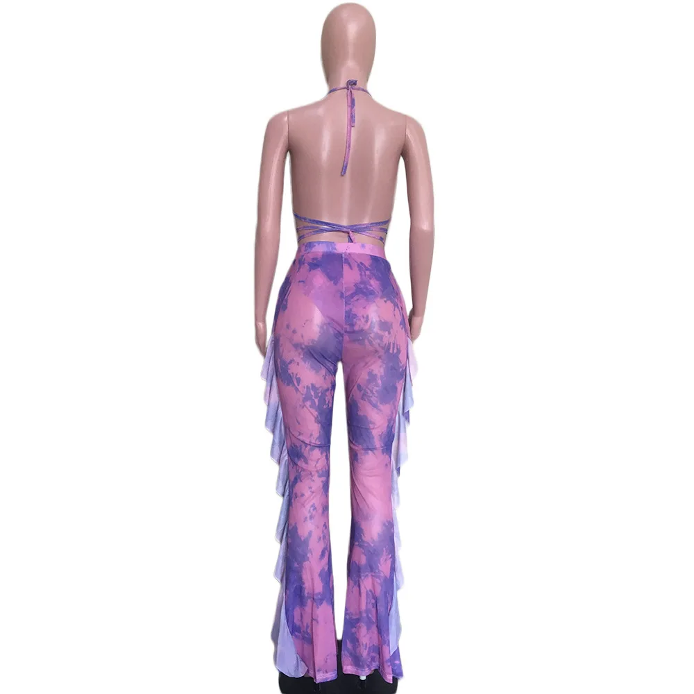 Женский спортивный костюм с принтом тай-дай, топ с V-образным вырезом и брюки с оборками, пляжный костюм из двух предметов, лето 2020