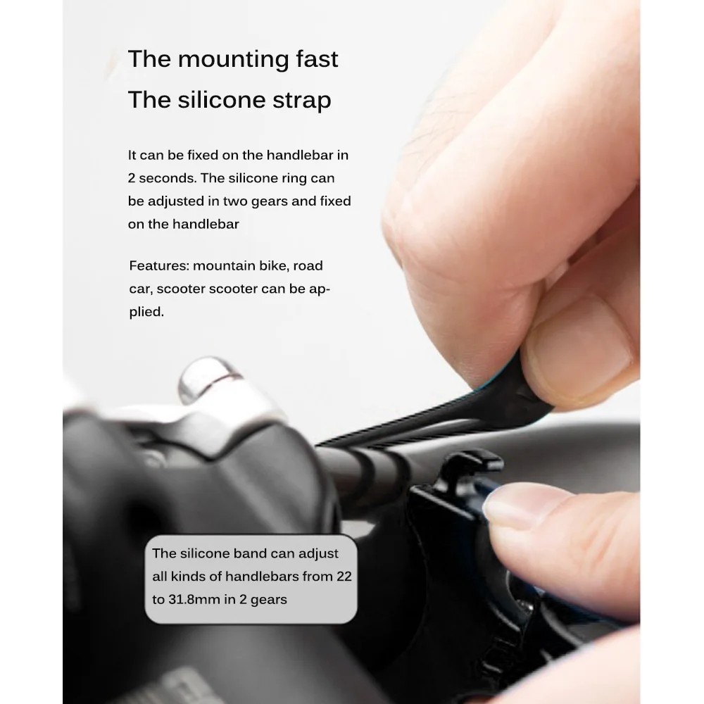 Велосипедное кольцо может быть легко установлено на рукоятке силиконовой лентой в течение 2 секунд. Силиконовая лента имеет два механизма для выбора, который подходит для ручки 22-31,8 мм. Он совместим с скутером, горным велосипедом, шоссейным велосипедом и т. д.