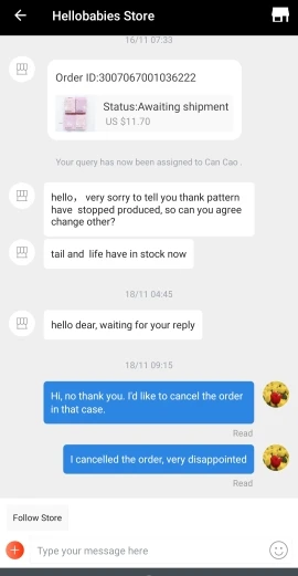 Ужасно, не покупайте здесь! Обслуживание клиентов очень грубое! У продавца не было моего товара на складе, и когда я попробовал отменить свой заказ, они сказали мне, что не согласны с отменой, потому что по той причине, по которой я уточнил (товар не в наличии) повредит их бизнес, поэтому они будут принимать мое отмену только если я солгал AliExpress. Когда я отказался сделать это, они «отправили» заказ с поддельным треком и следом, и я был заставлен оспорить заказ, что, в свою очередь, гарантирует, что они больше не будут караться AliExpress за продажу товара, который они даже не производят. Для защиты см. Скриншоты!