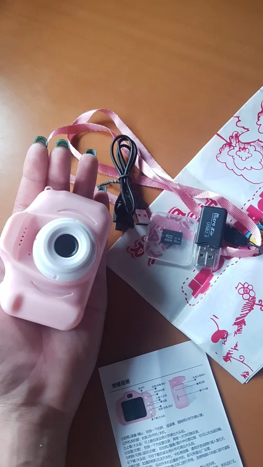 Продавец отправил заказ очень быстро, доставка в СПб - меньше 3 недель. Камера хорошо упакована, в комплекте - карта памяти в отдельном футляре, кардридер, шнур USB для зарядки и шнурок-подвес. Для маленького ребёнка очень милая игрушка. Качество съемки, конечно, не очень хорошее. Можно менять разрешение для съёмки фото и видео, но это не очень помогает. Можно настроить дату. Есть несколько игр, можно играть прямо в фотоаппарате.