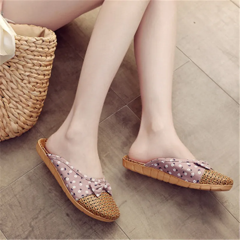Летние домашние шлепанцы FAYUEKEY для женщин, льняные тканые повседневные шлепанцы с цветочным принтом, женские сандалии на плоской подошве, тапочки льняные